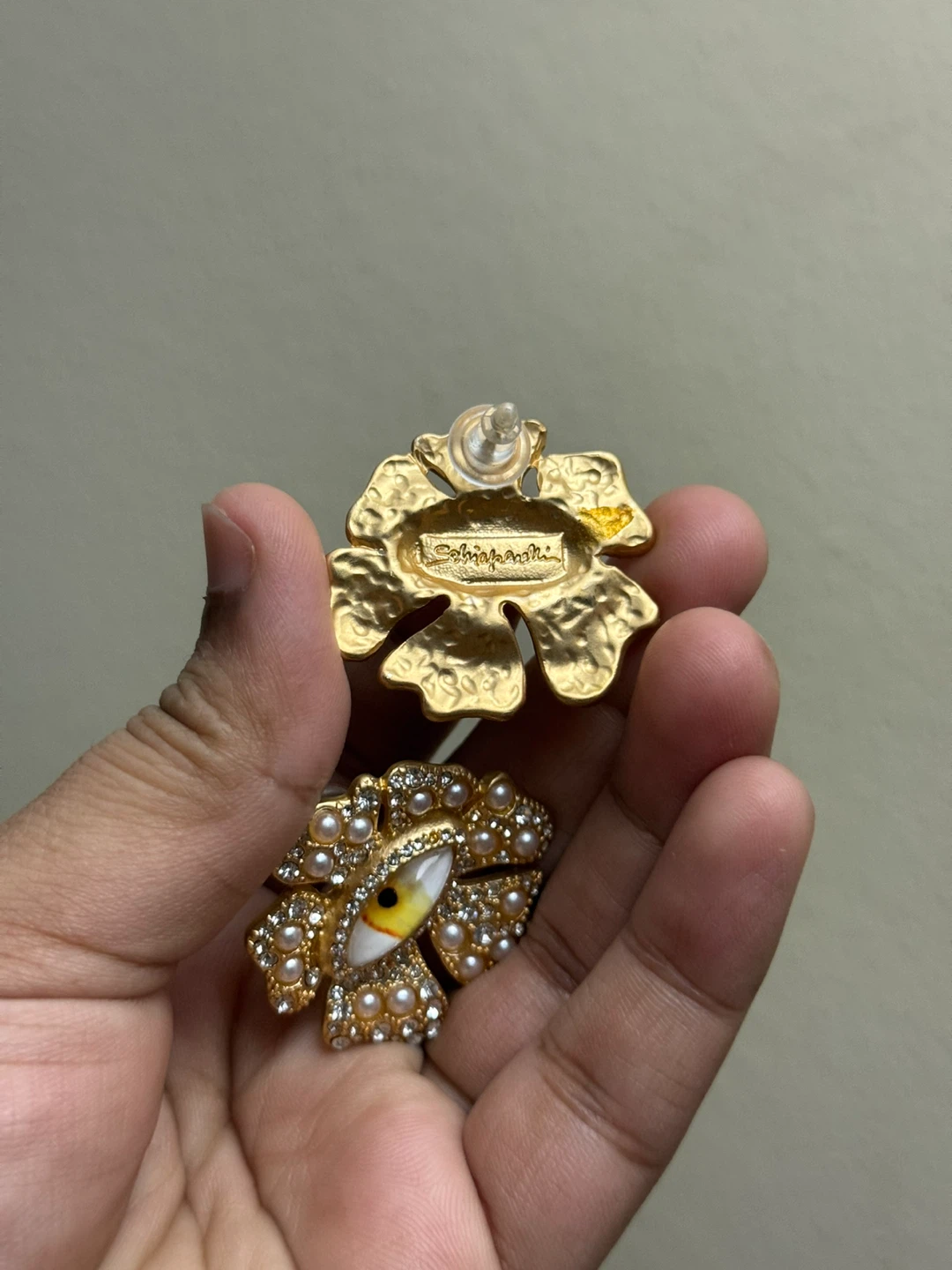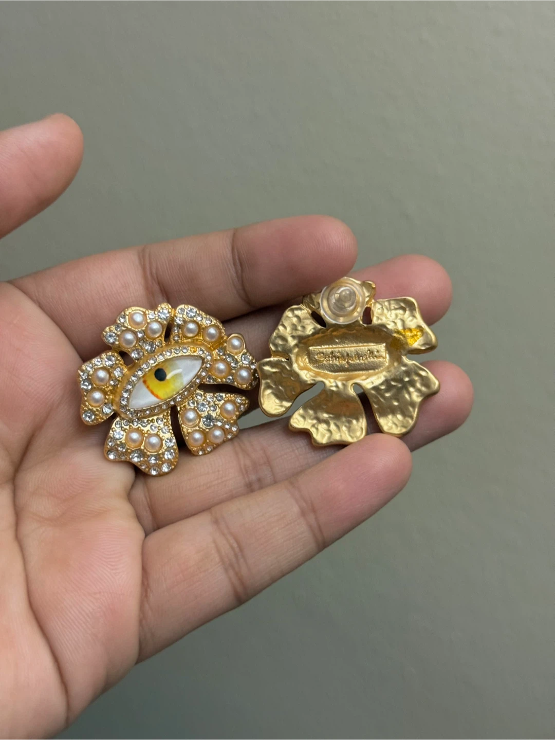 These stunning gold earrings feature a unique eye design adorned with pearls and crystals. Perfect for adding a touch of elegance to any outfit.