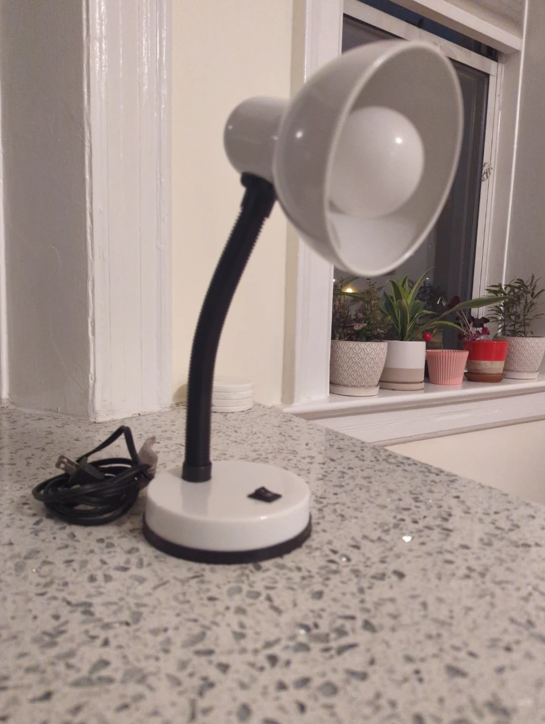 This is a white gooseneck desk lamp. It features a flexible neck for adjustable lighting. The lamp has an on/off switch on the base. It's great for a desk or bedside table!