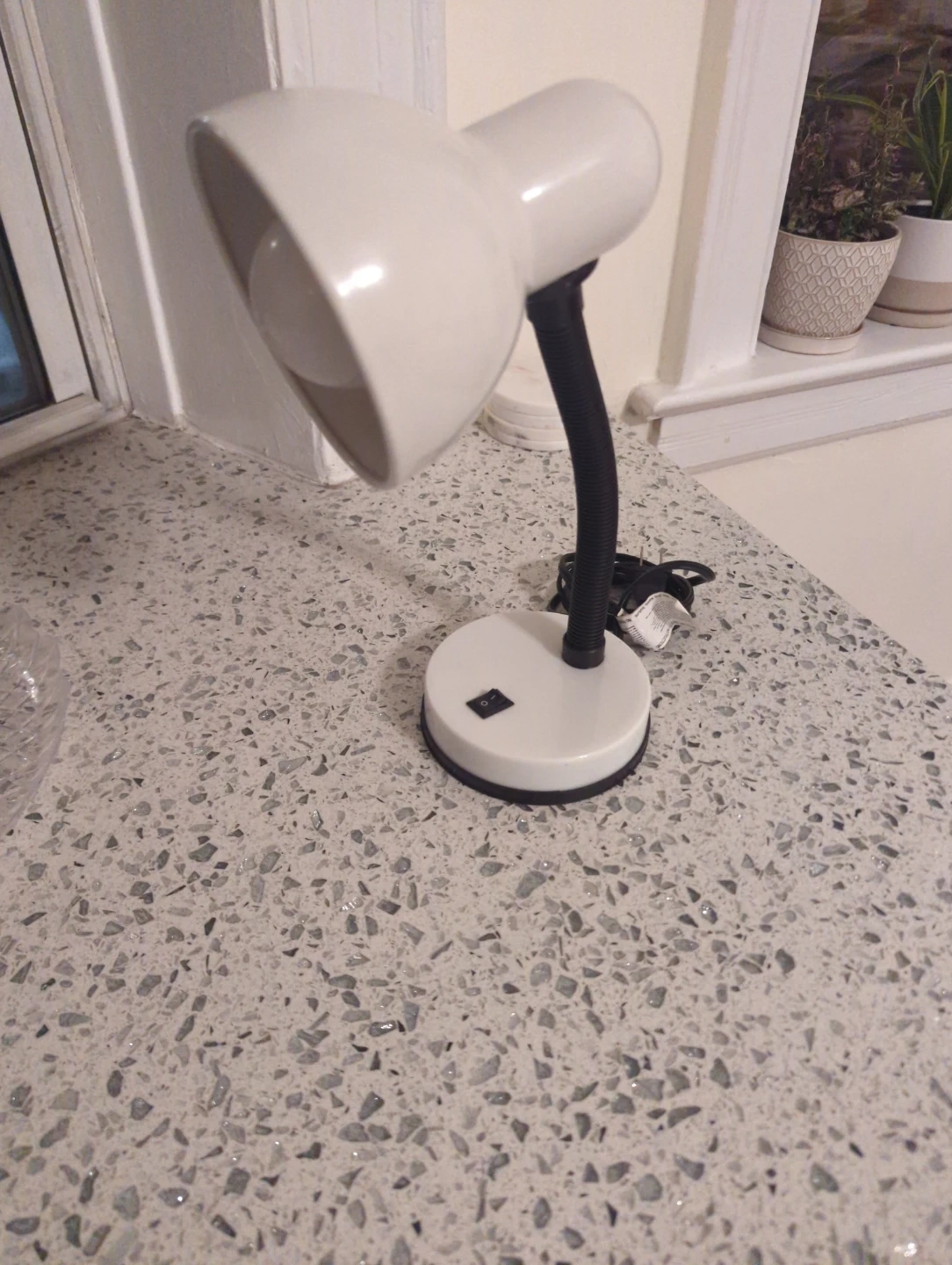 This is a white gooseneck desk lamp. It features a flexible neck for adjustable lighting. The lamp has an on/off switch on the base. It's great for a desk or bedside table!