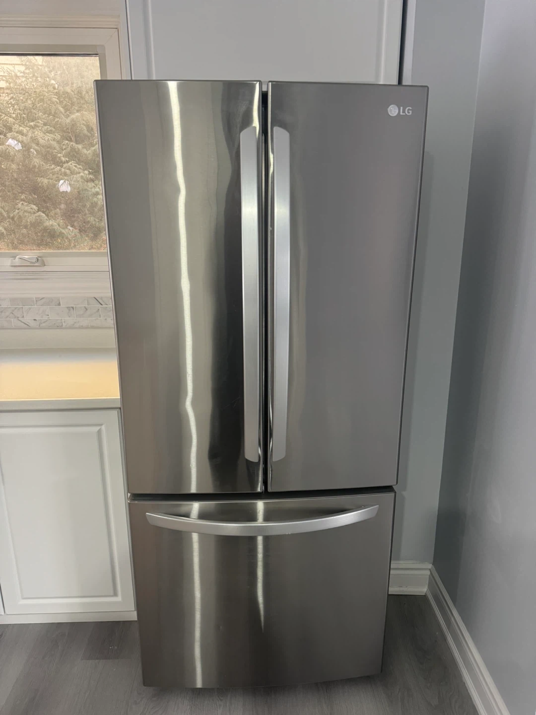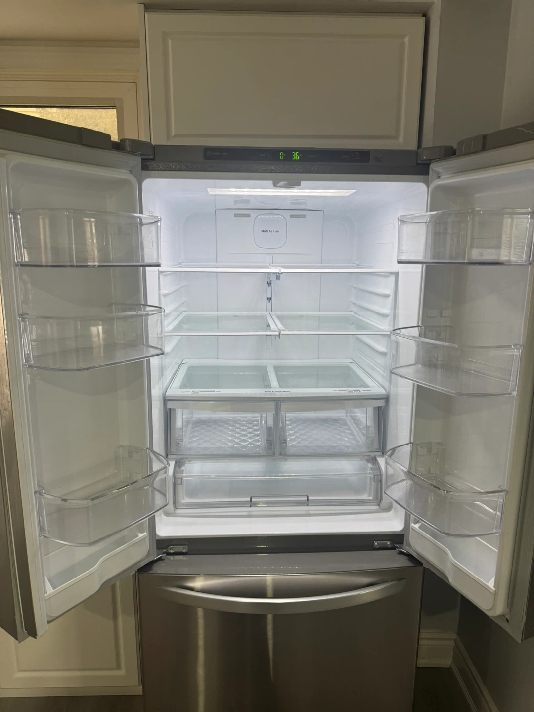 LG stainless steel French door refrigerator with bottom freezer. It has a large capacity and multiple adjustable shelves. Like new! Only used for 4 months, we are renovating and require a different style.