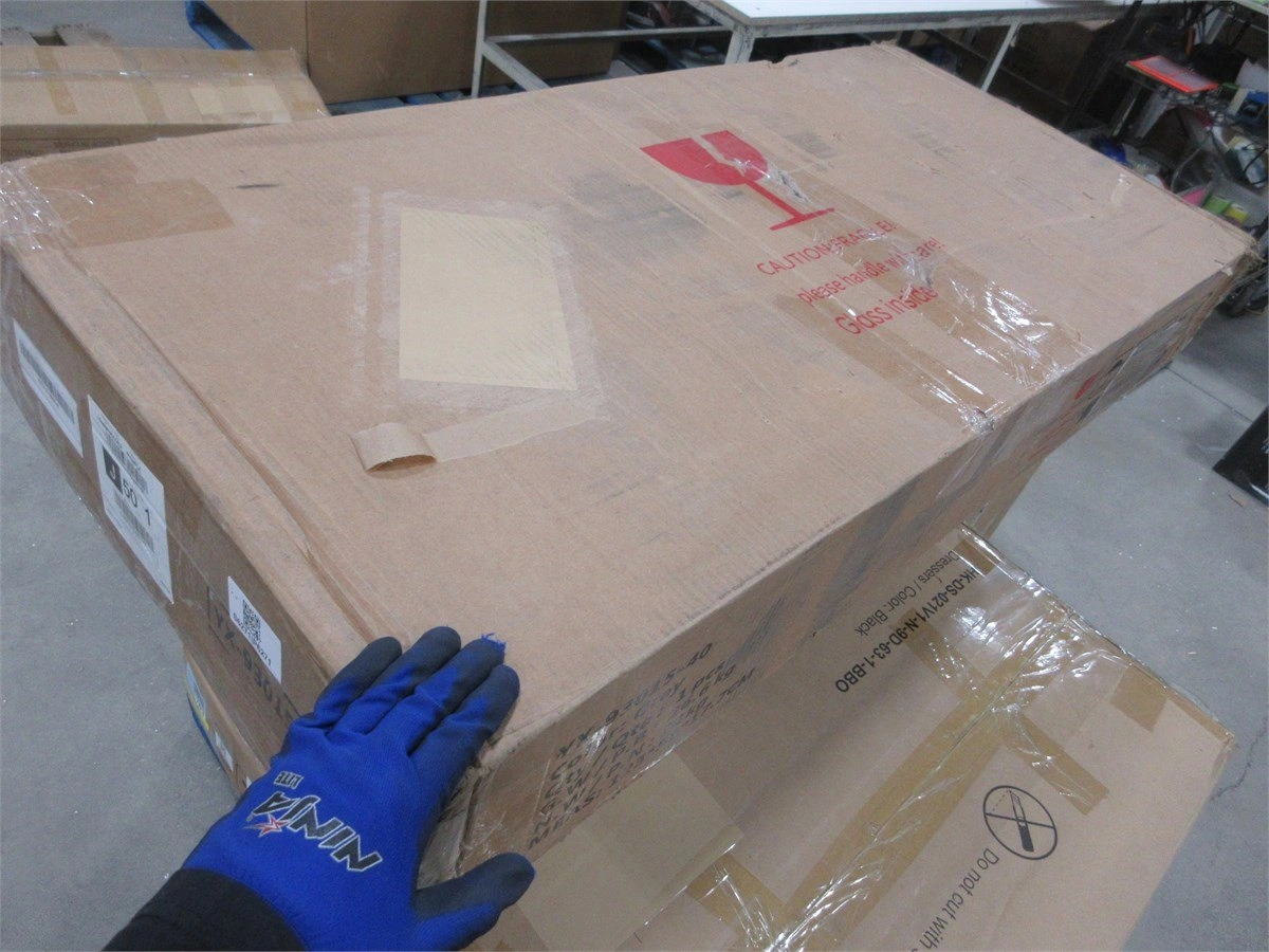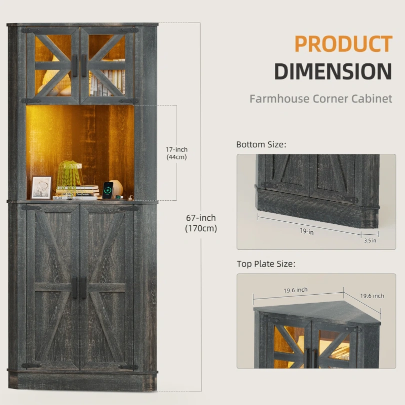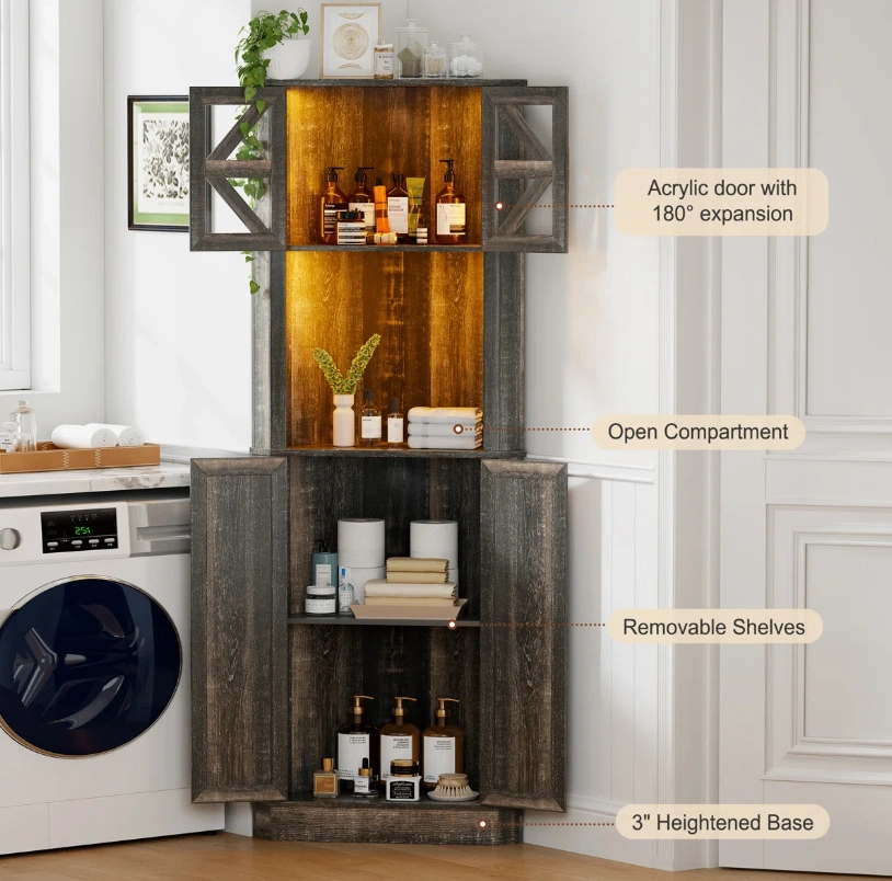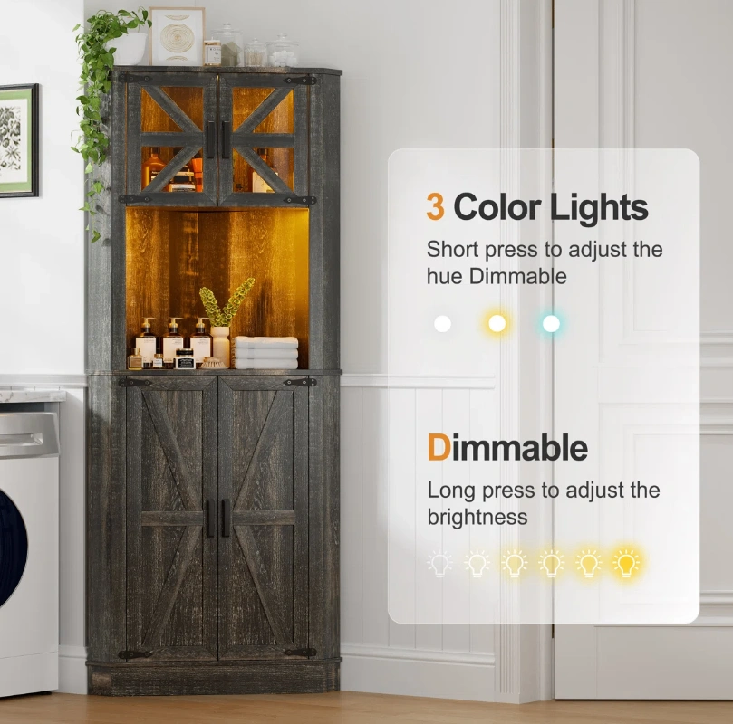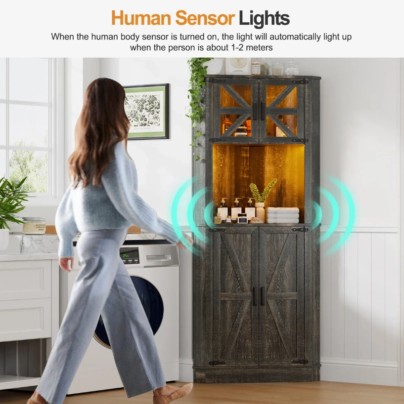 This corner cabinet features a barn door design with a handle and a 3" heightened base. It also has 3 colour lights that are dimmable, and human sensor lights that turn on automatically when someone is 1-2 meters away. It also features an acrylic door with 180° expansion, open compartments, and removable shelves