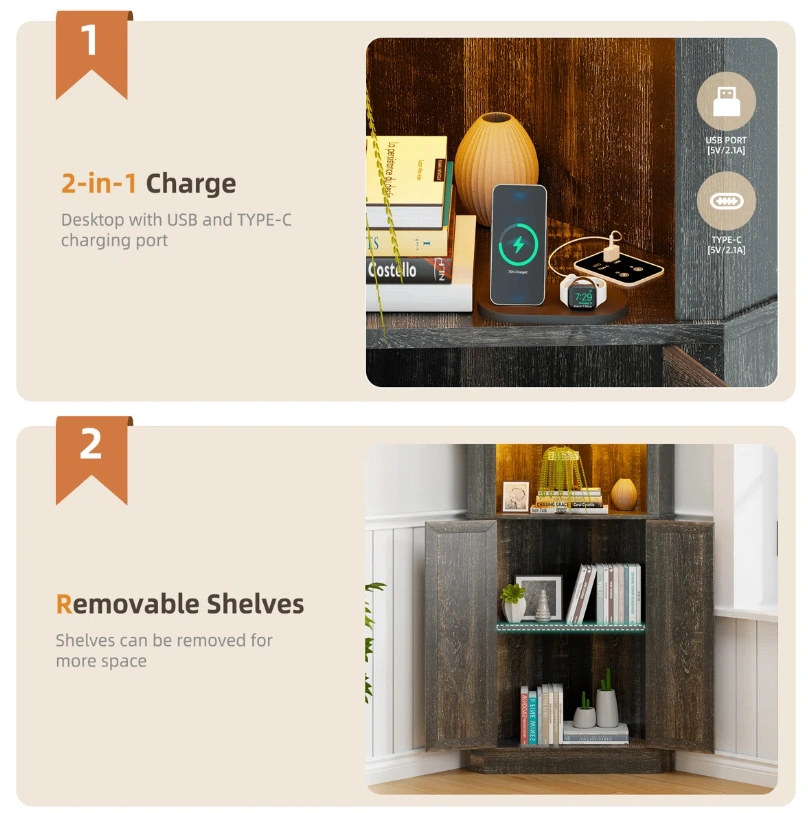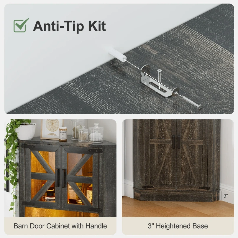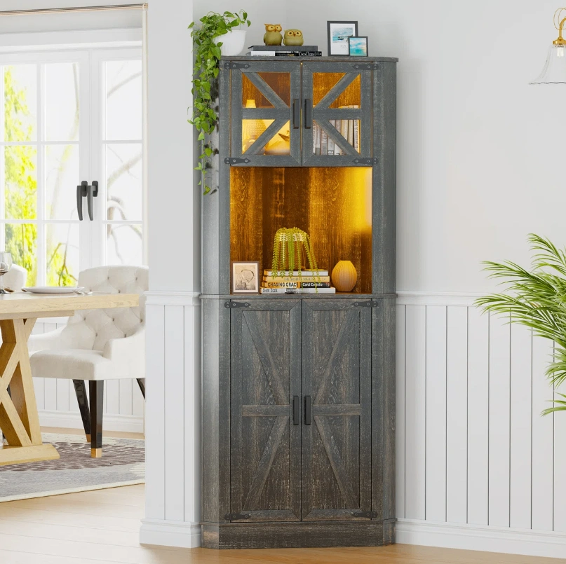 This corner cabinet features a barn door design with a handle and a 3" heightened base. It also has 3 colour lights that are dimmable, and human sensor lights that turn on automatically when someone is 1-2 meters away. It also features an acrylic door with 180° expansion, open compartments, and removable shelves