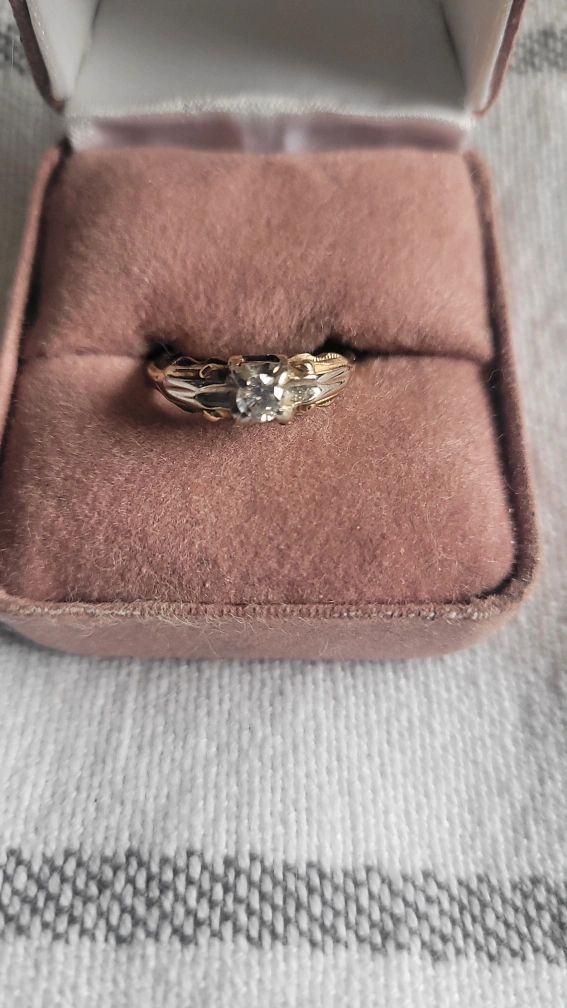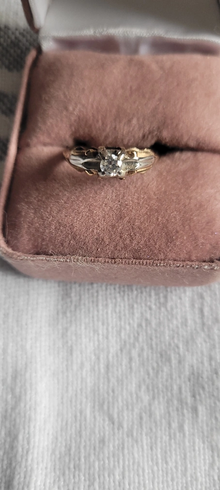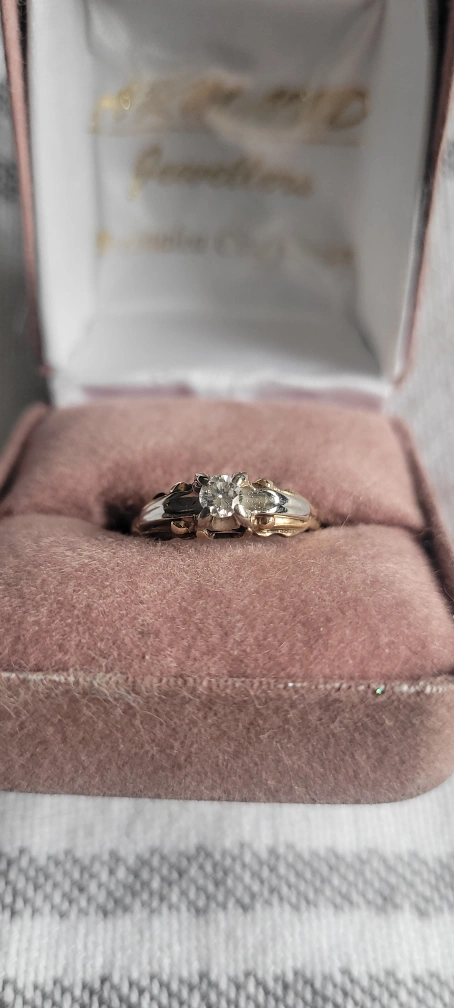 Beautiful vintage ring. Features a single diamond solitaire. Two-toned gold band. Presented in original box.