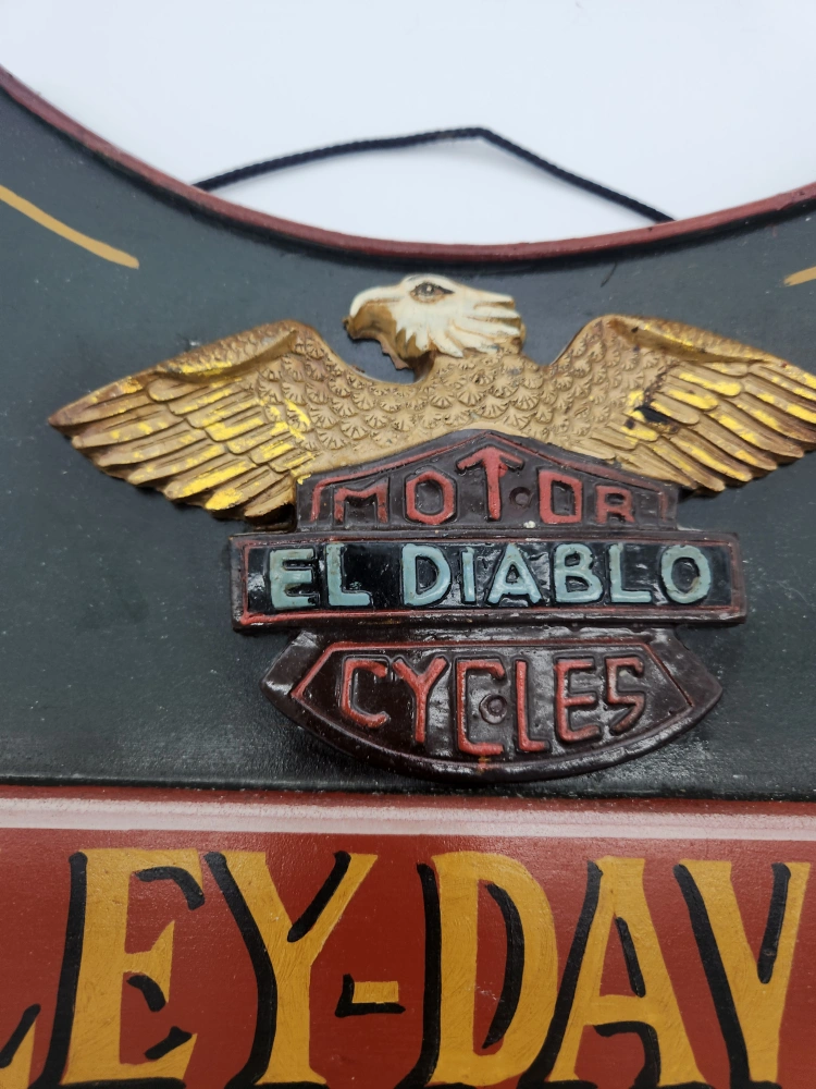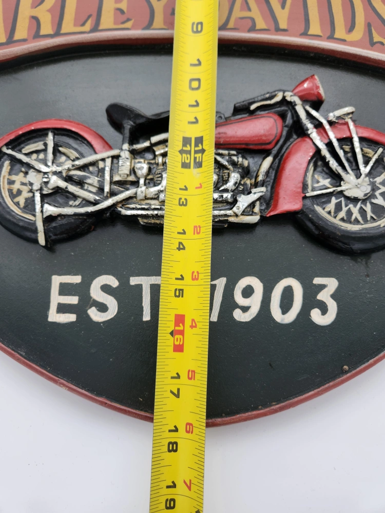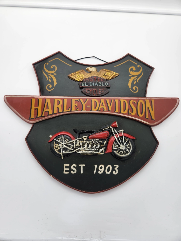 Vintage-style Harley-Davidson wall plaque. Features an embossed eagle, motorcycle graphic, and "Est 1903". Measures approximately 18 inches in height. Great for garages, man caves, or motorcycle enthusiasts.
