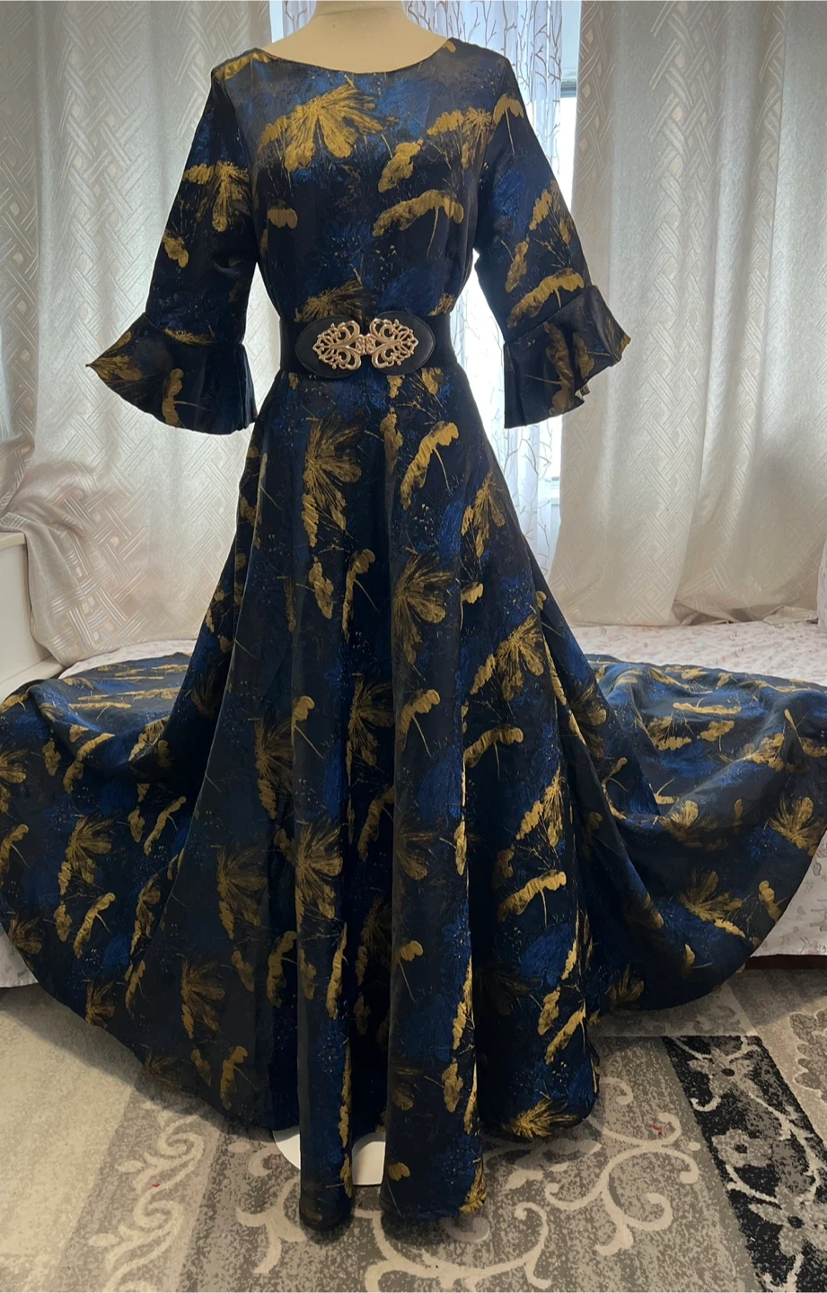 A stunning navy blue and gold brocade gown featuring a bold leaf-like pattern. It has a fitted bodice with elegant flared sleeves and a full, flowing skirt. The gown comes with a matching black belt adorned with a decorative gold buckle. Material is a rich brocade fabric.