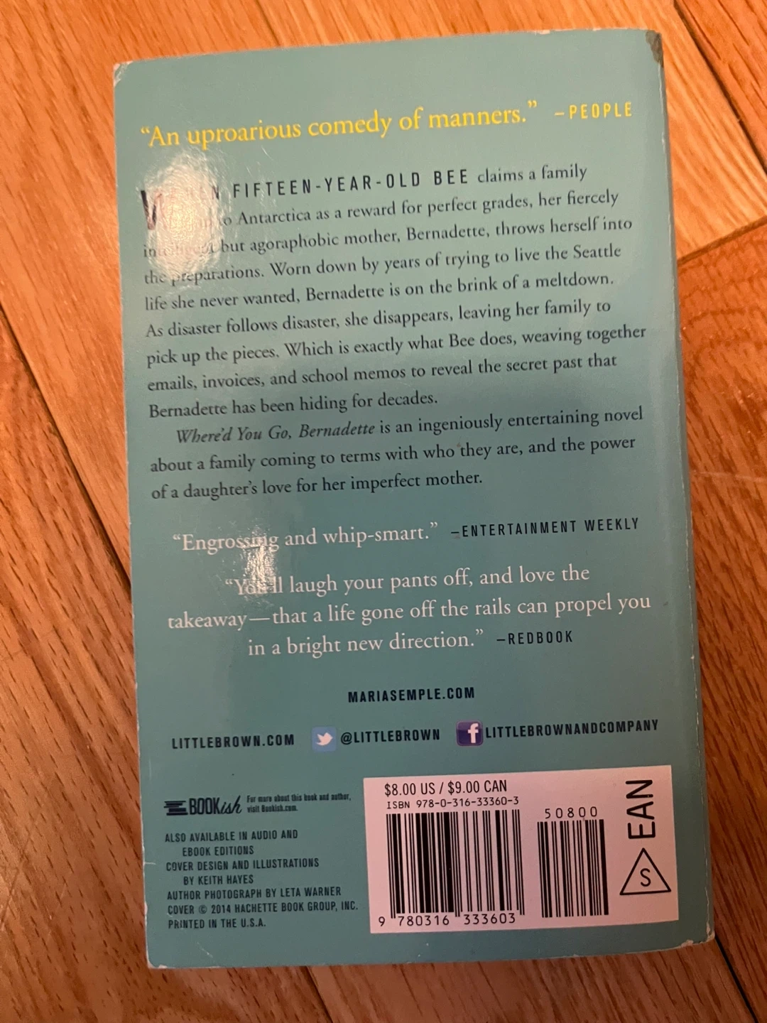 Selling the book "Where'd You Go, Bernadette" by Maria Semple! It's a runaway bestseller and a really funny read. The book is an uproarious comedy of manners and tells the story of a family's journey to Antarctica. It's an entertaining novel about family, coming to terms with who they are, and the power of a daughter's love for her imperfect mother