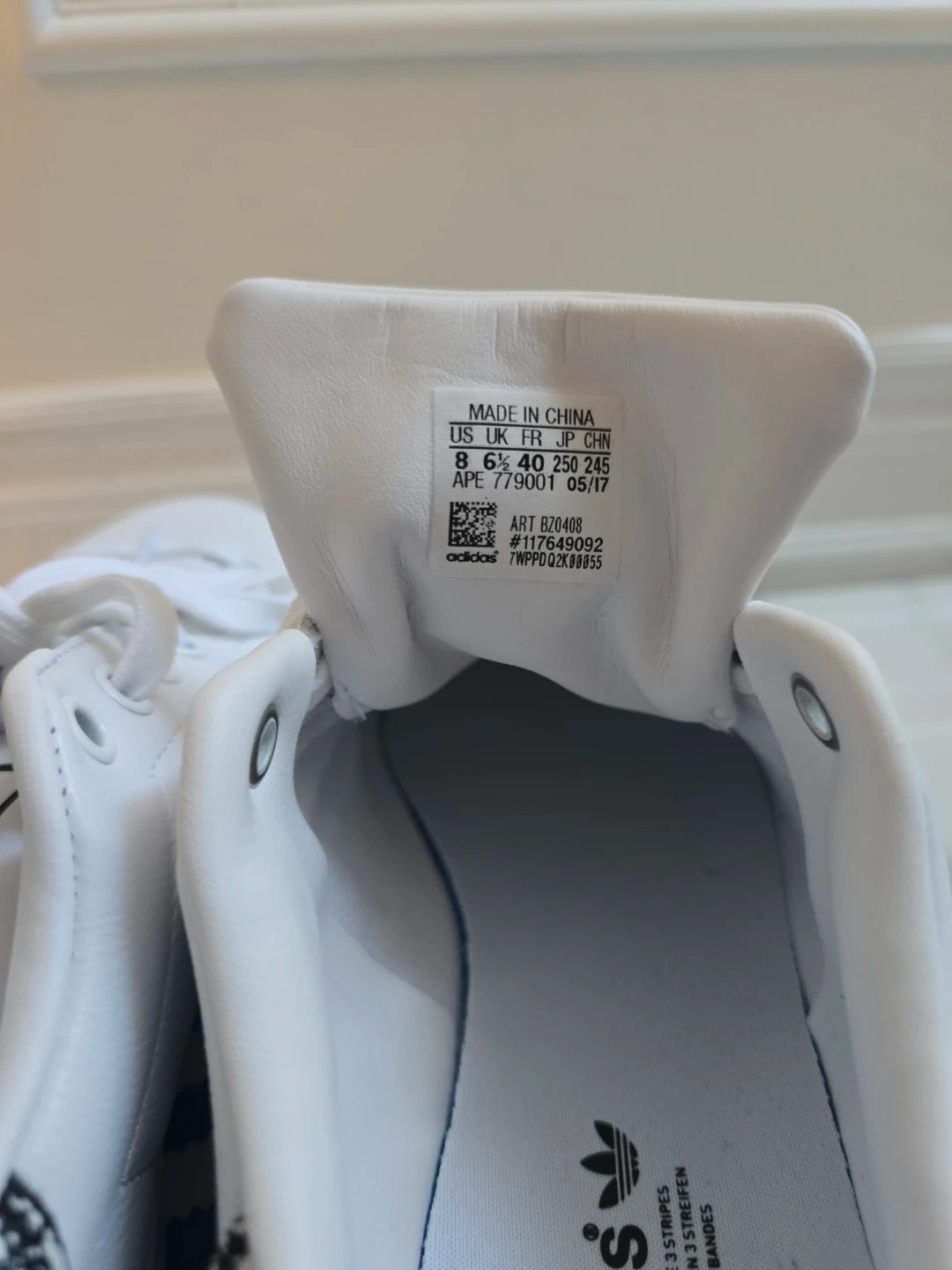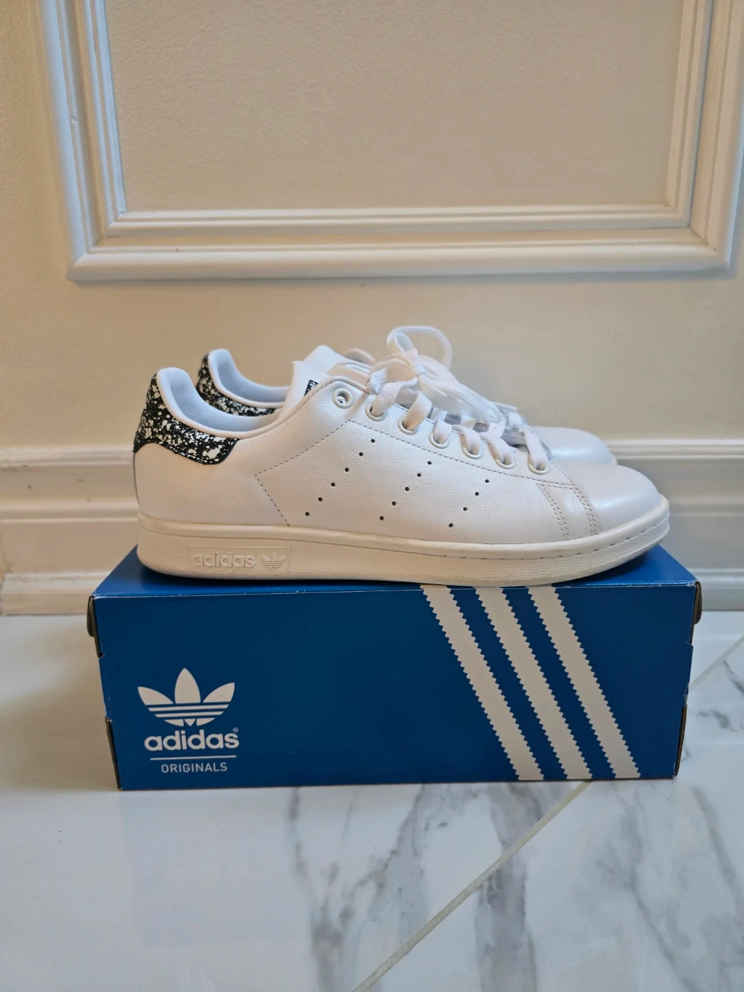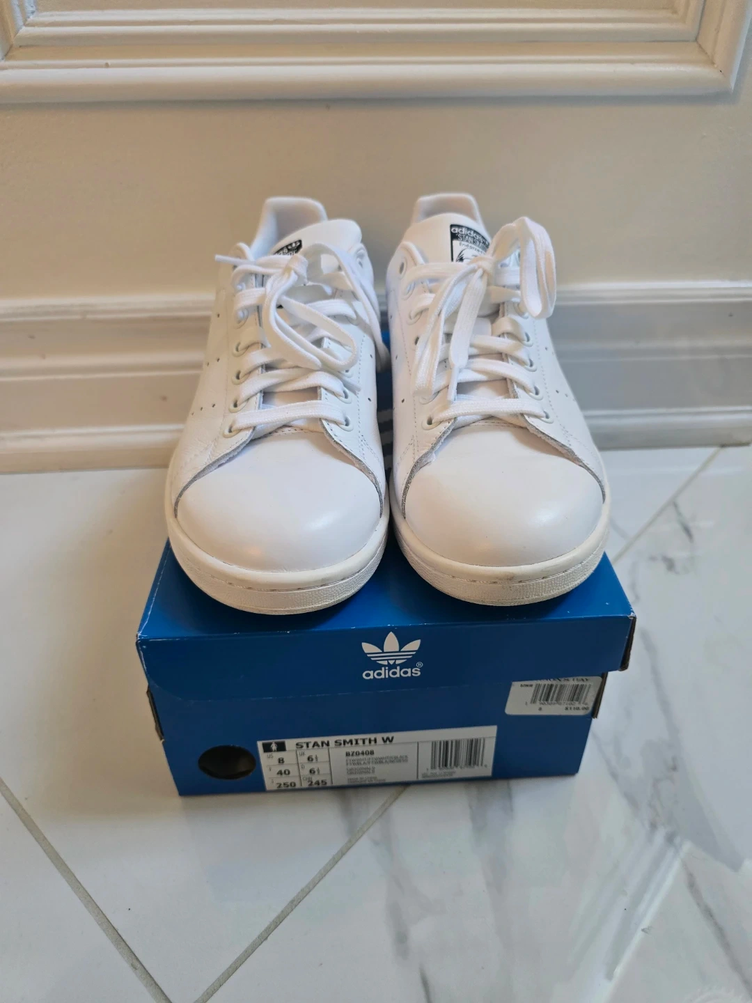 Classic white Adidas Stan Smith sneakers for women. Leather upper with signature perforated 3-Stripes detail. Includes original box. Women size 8 worn once, excellent condition