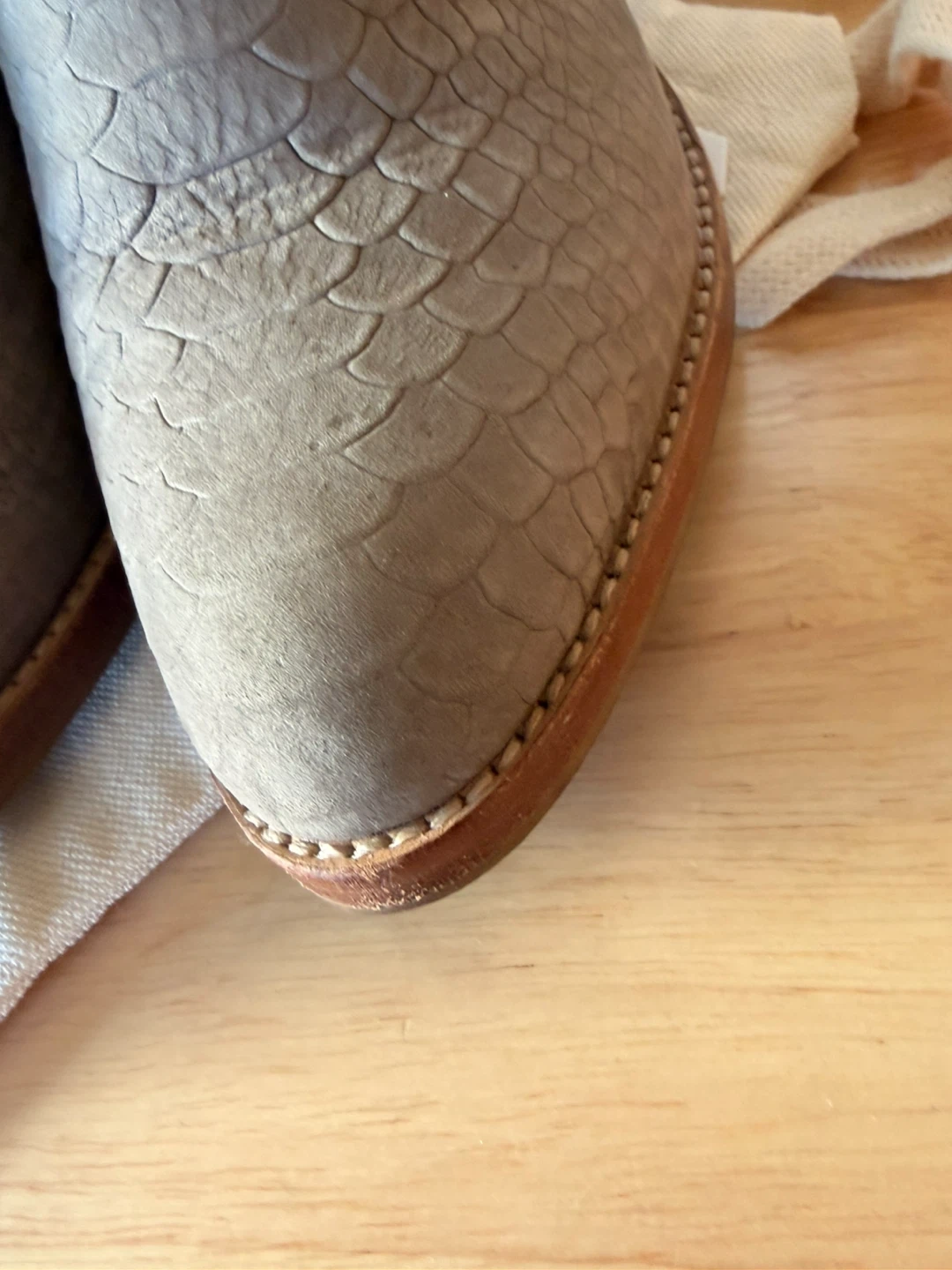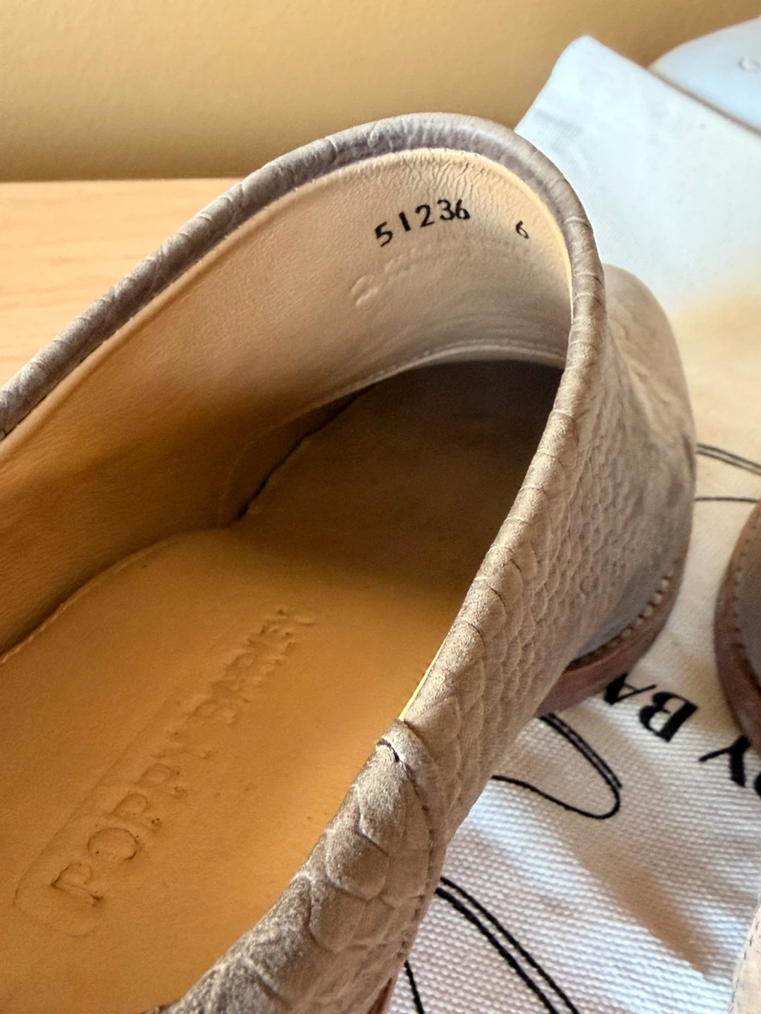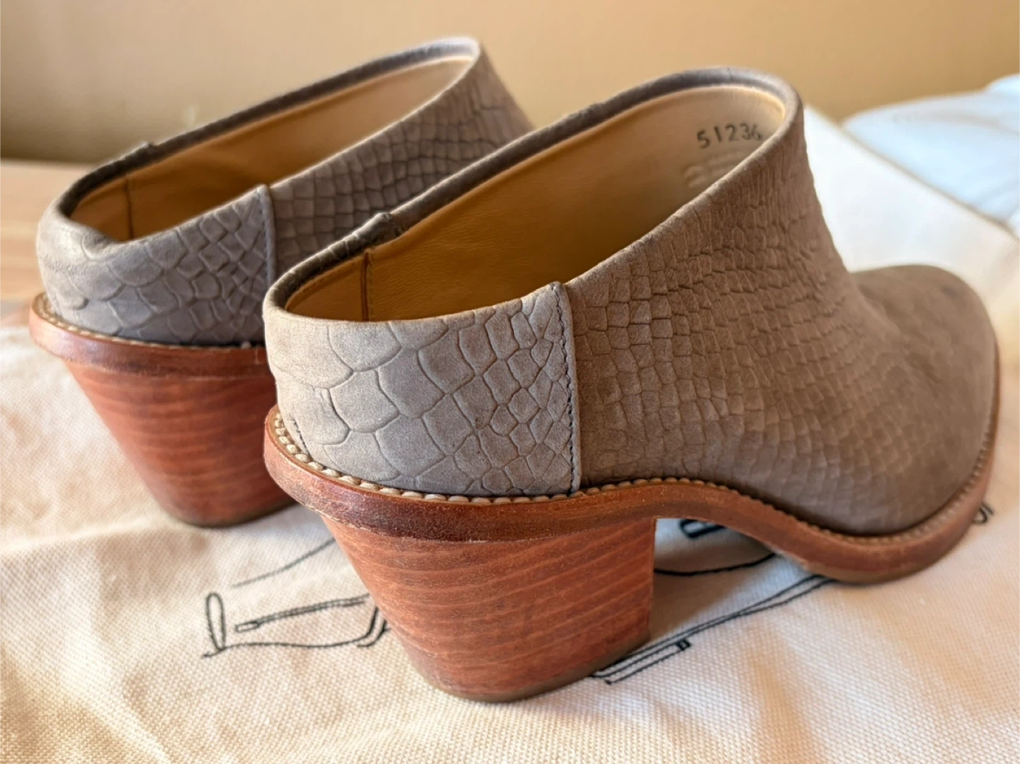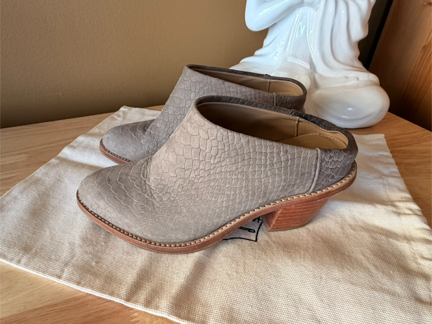 These Poppy Barley Market mules are made from grey embossed leather with a wooden heel. They have a comfortable slip-on design. Size is 6 W
