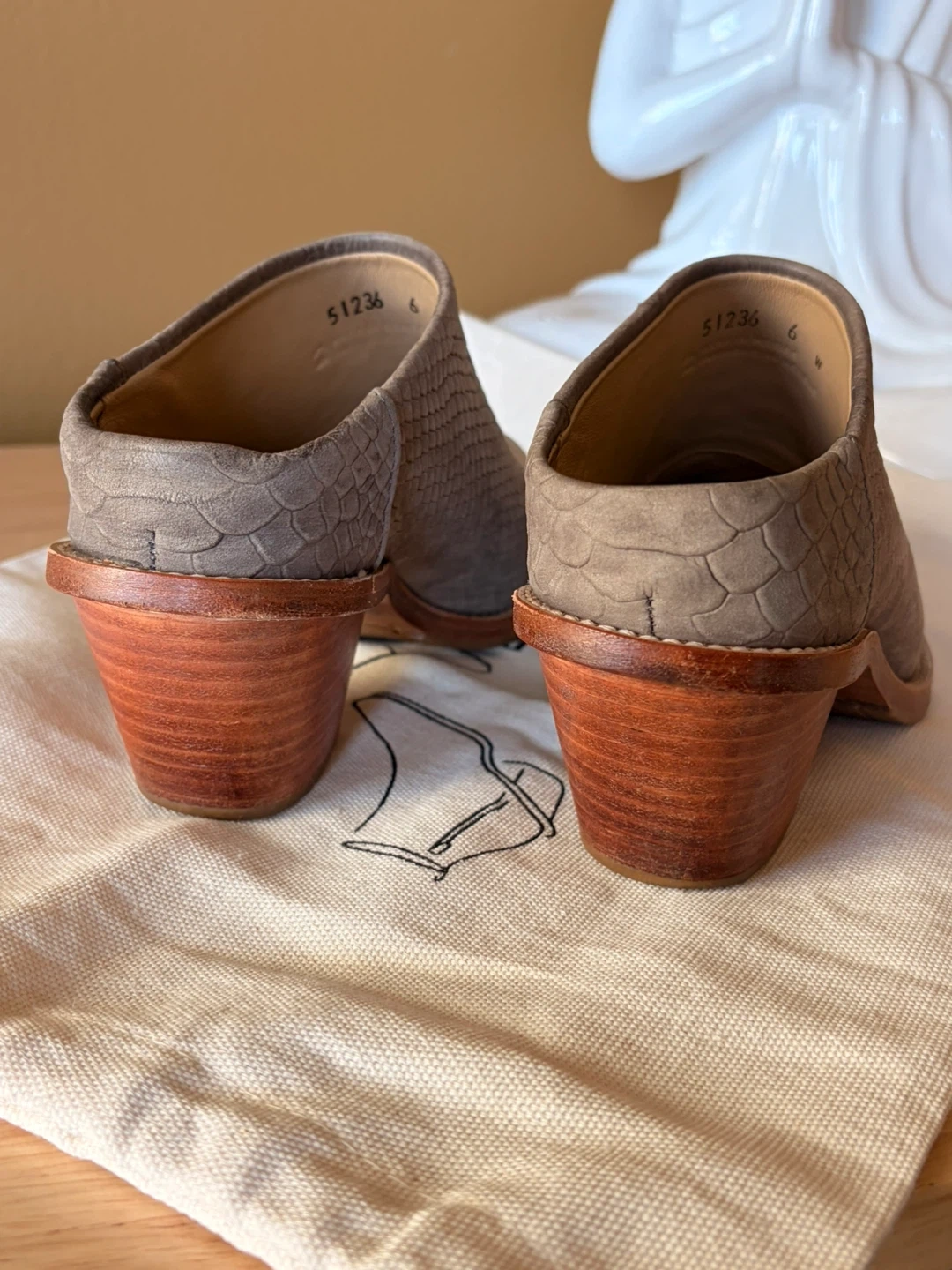 These Poppy Barley Market mules are made from grey embossed leather with a wooden heel. They have a comfortable slip-on design. Size is 6 W