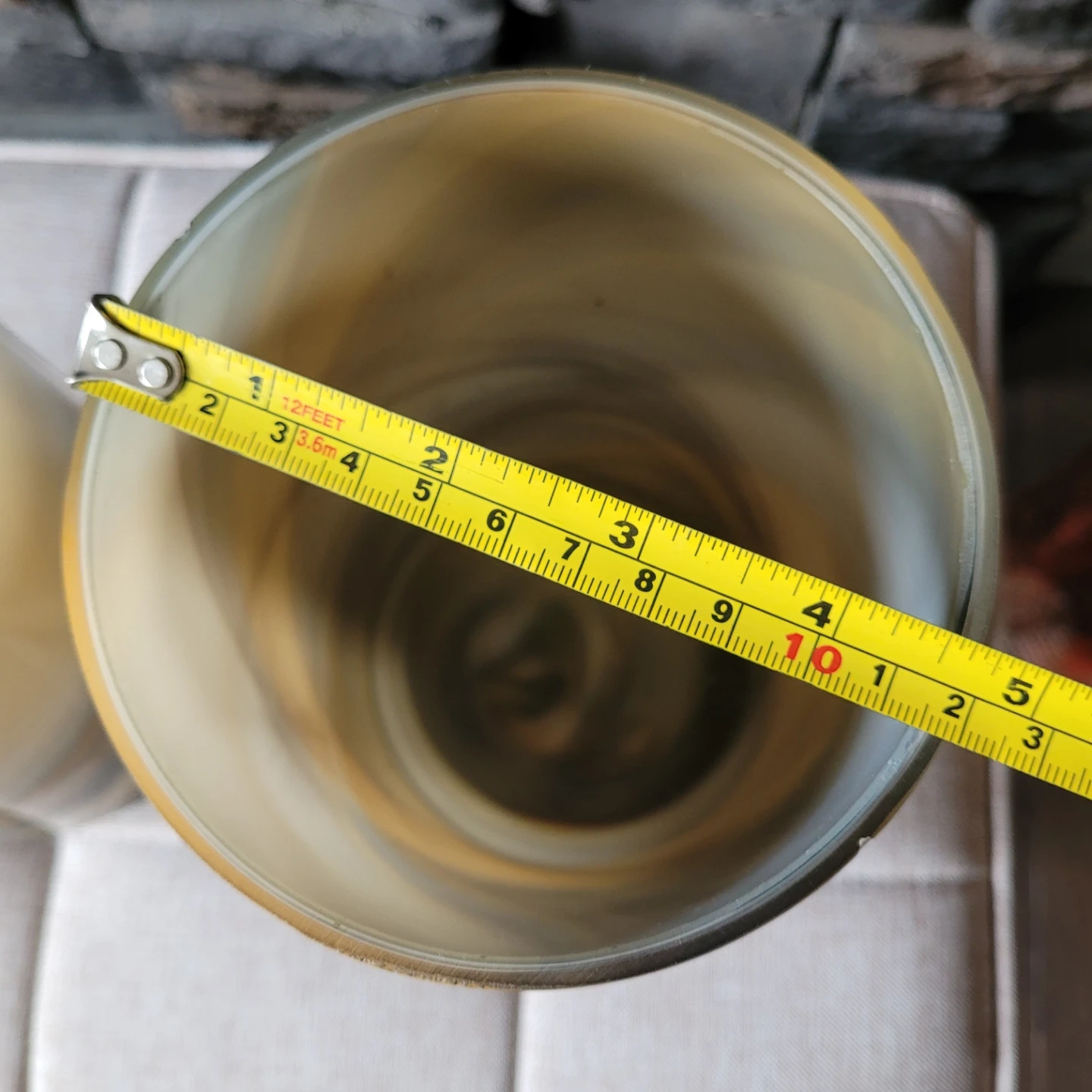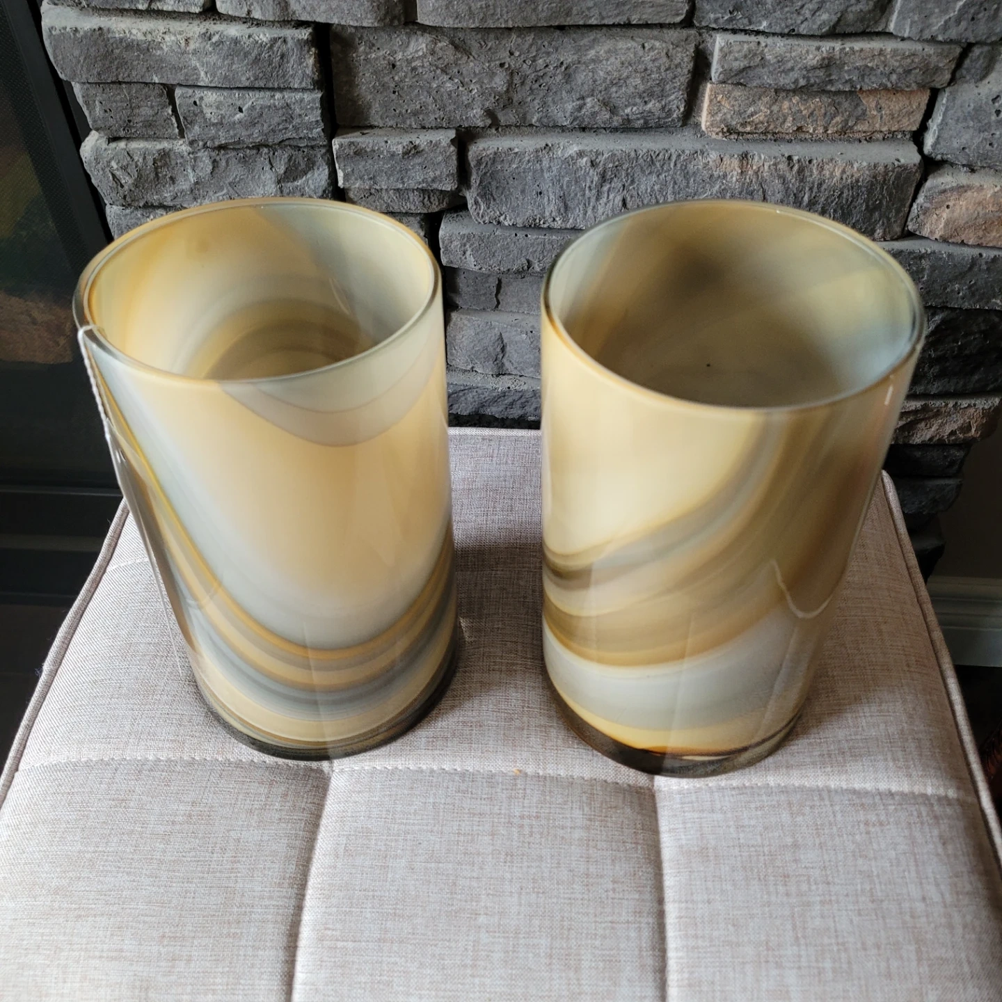 Here's a beautiful set of two Sofa Land vases in an amber and smoke colour palette. They stand just over 8 inches tall and have a diameter of about 5 inches wide.