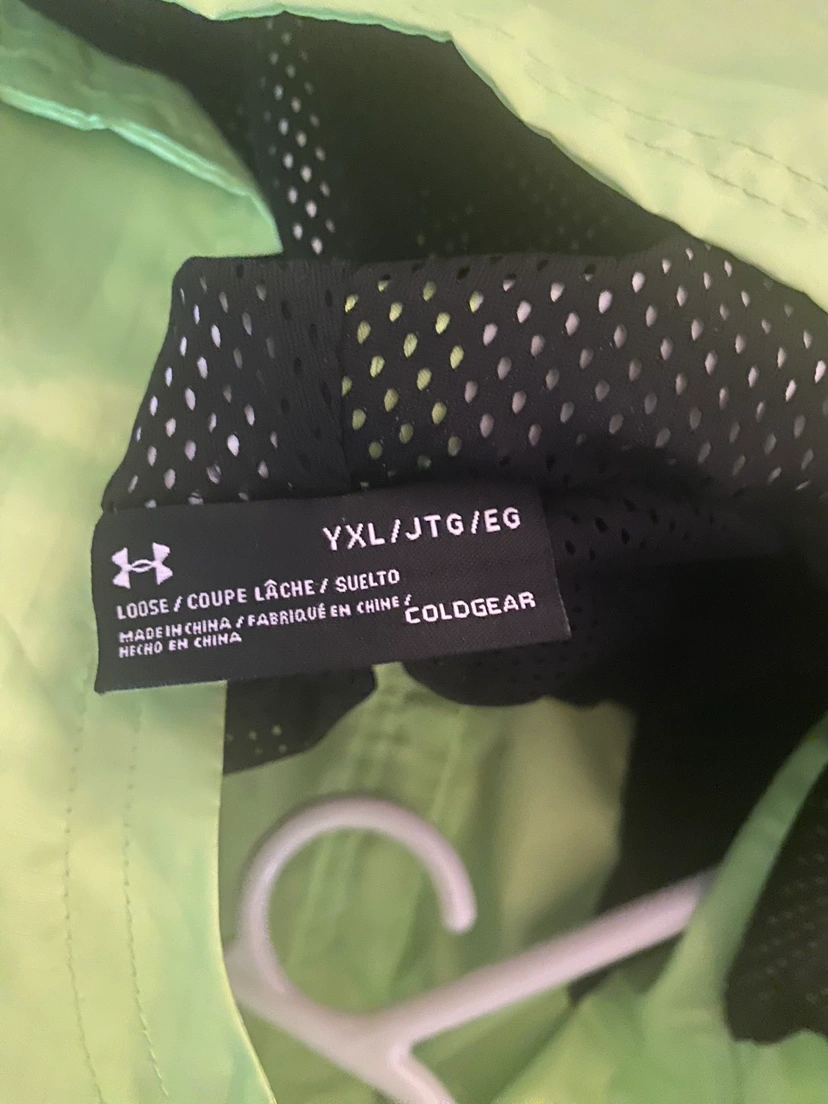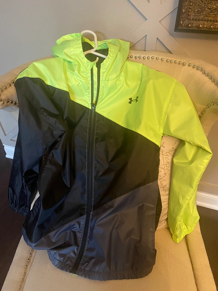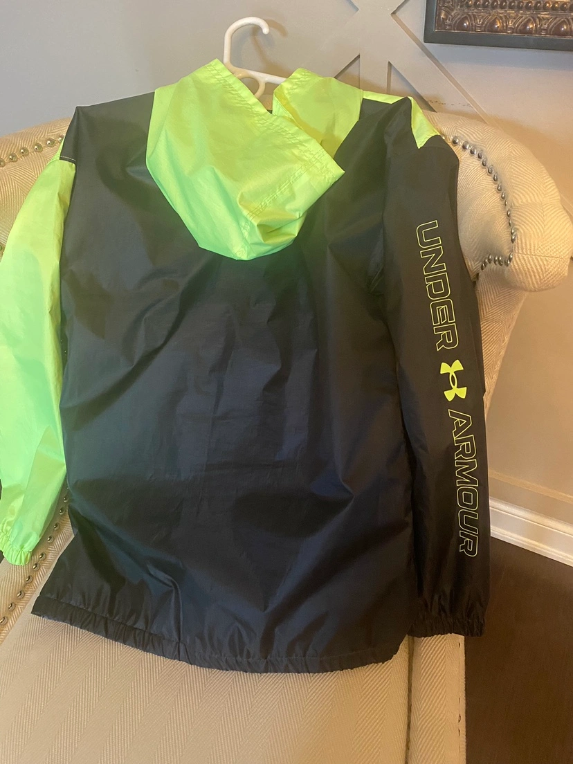 Kids Under Armour rain jacket with a neon green and black colour scheme. The jacket has a hood and a zipper closure. It is a youth size XL