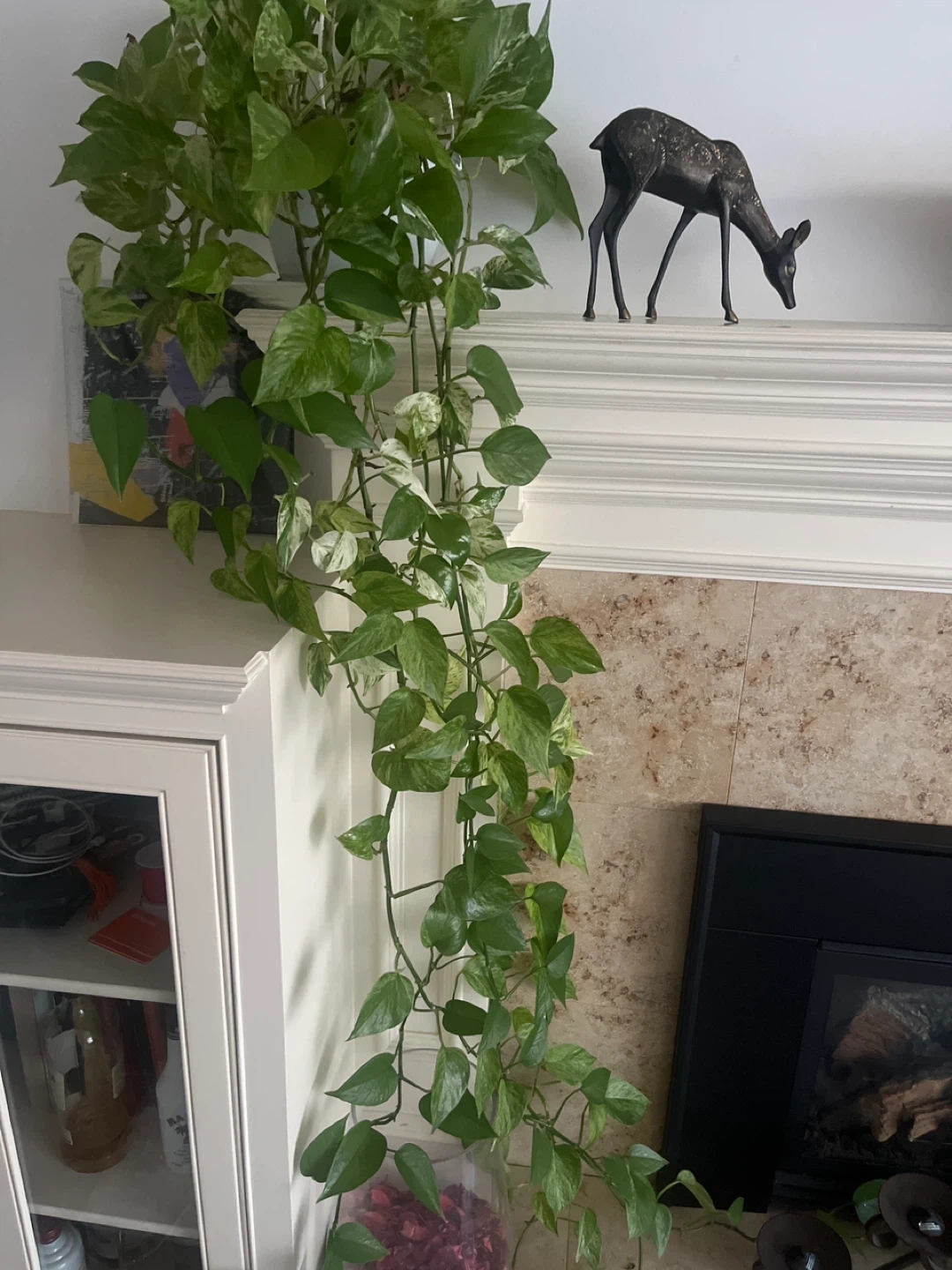 A lush Marble Queen Pothos plant with vibrant green and white variegated leaves. This trailing plant adds a touch of greenery to any space. It's known for its easy-care nature.