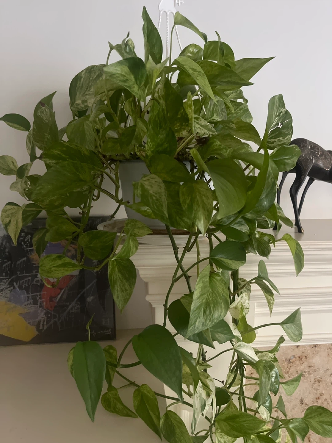 A lush Marble Queen Pothos plant with vibrant green and white variegated leaves. This trailing plant adds a touch of greenery to any space. It's known for its easy-care nature.