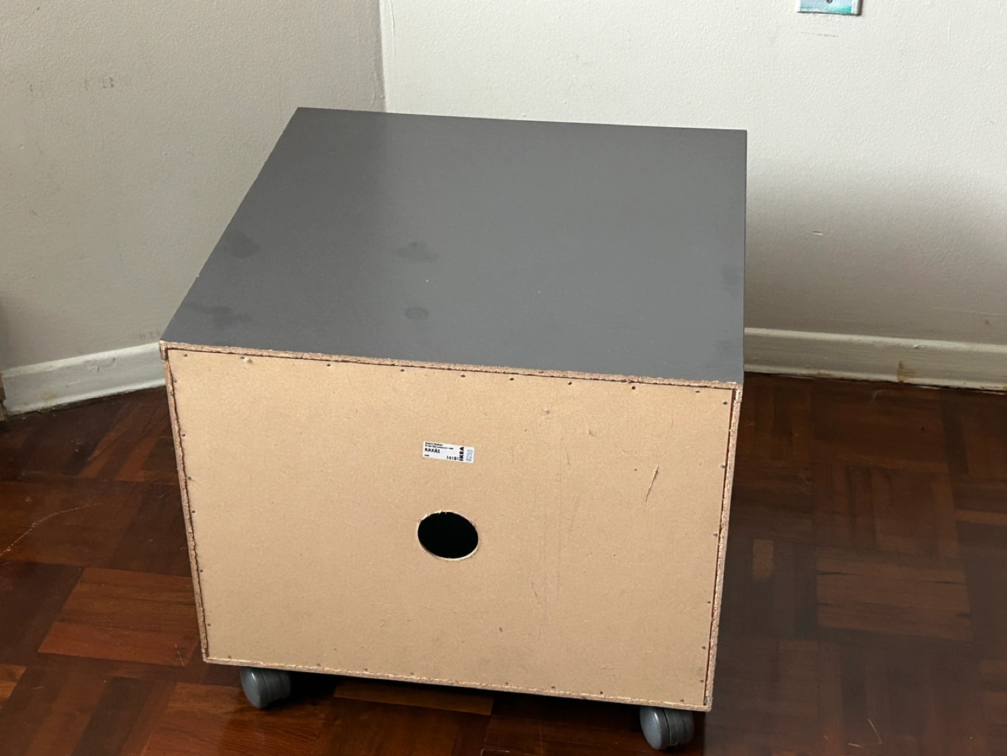 Dark grey top cabinet. Four wheels for mobility. Small shelf inside. Shelf is height adjustable and removable. Good used condition. Can be used as a TV stand, TV cart, or a bar.