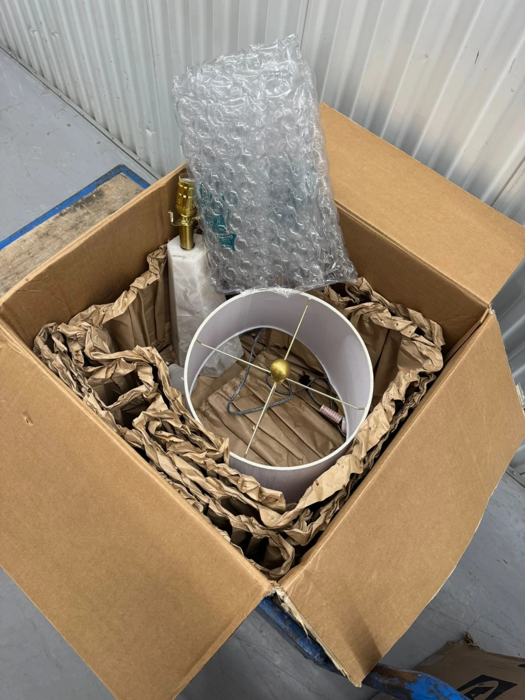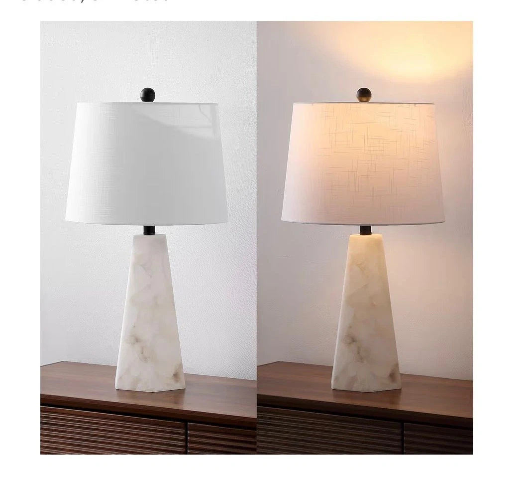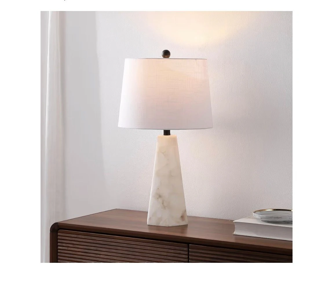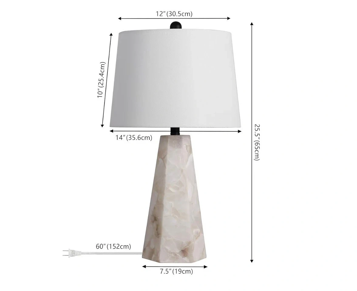 Accent table lamp with a unique tapered marble stone base and a white linen drum shade. It's 25.5 inches tall with a 14-inch shade diameter. The power cord is 60 inches long. This lamp's elegant design adds a touch of sophistication to any room.