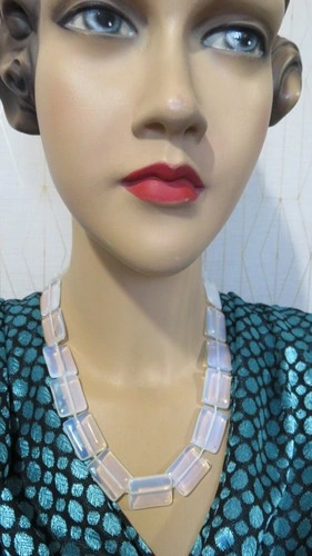 Elevate your jewelry collection with this exquisite Antique Vintage OPALINE OPALESCENT Opalite Rectangle Necklace. The pendant showcases a captivating fire moonstone, complemented by a series of beautifully faceted glass stones that exude an opalescent pale blue hue, reminiscent of the celestial glow. The necklace's rectangular beads, carefully crafted by hand, add a touch of artisanal charm, making it a unique piece for any fashion enthusiast. Its light-colored diamond intensity and celestial theme make it an elegant accessory for those who appreciate artistry and beauty in their jewelry. This original piece, from a time when craftsmanship was paramount, is a testament to the timeless allure of vintage fashion.