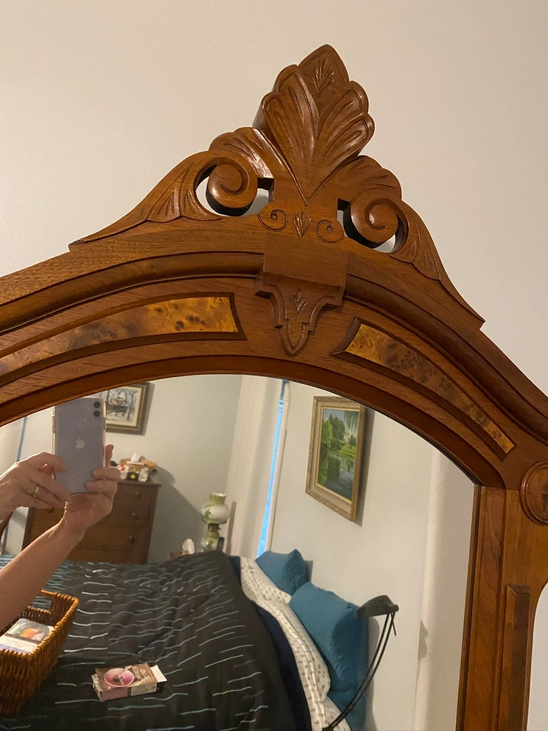 Beautiful antique wood vanity dresser featuring an ornate mirror. It has several drawers for storage and intricate detailing throughout. This piece would make a lovely addition to a bedroom.
