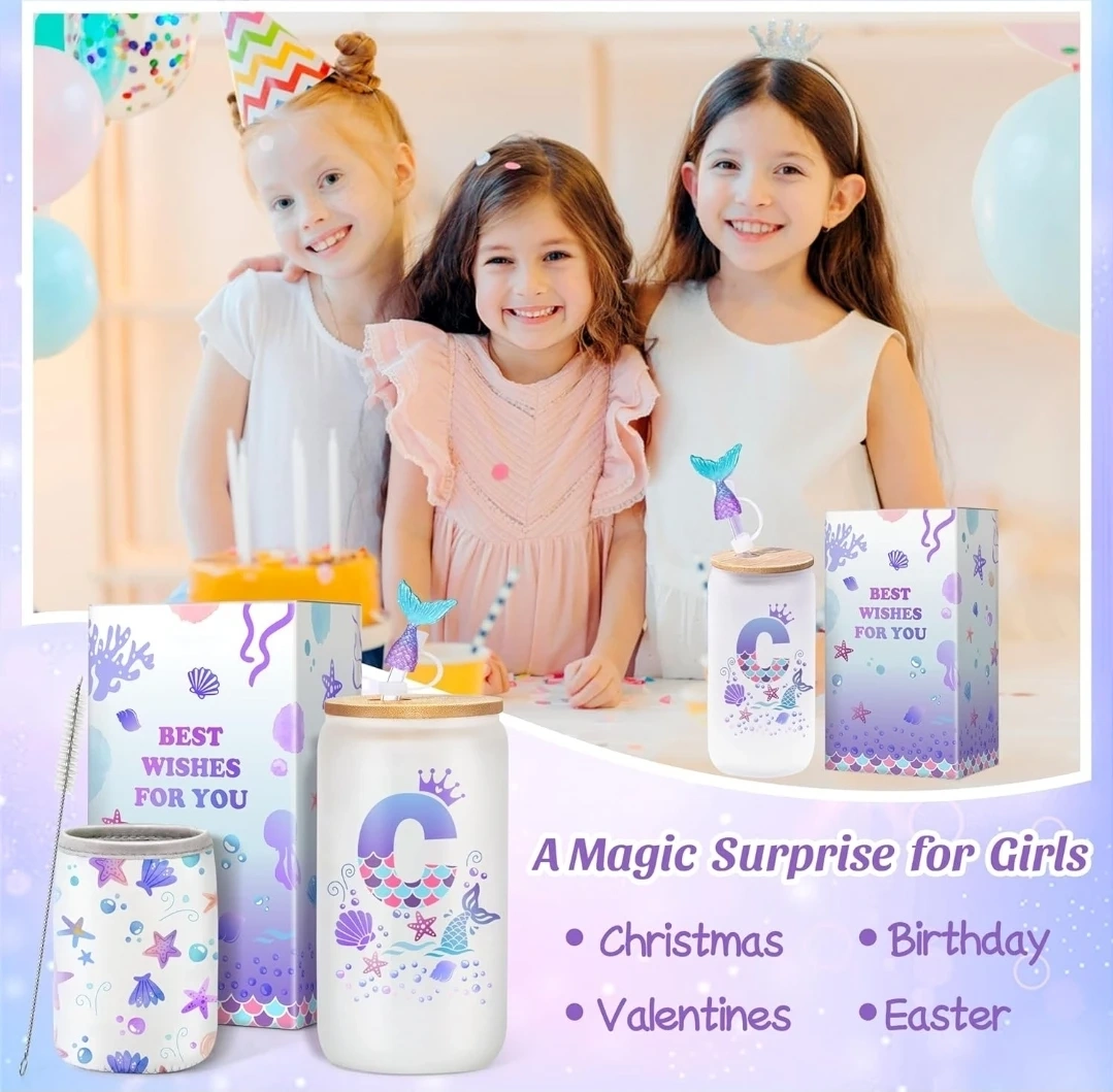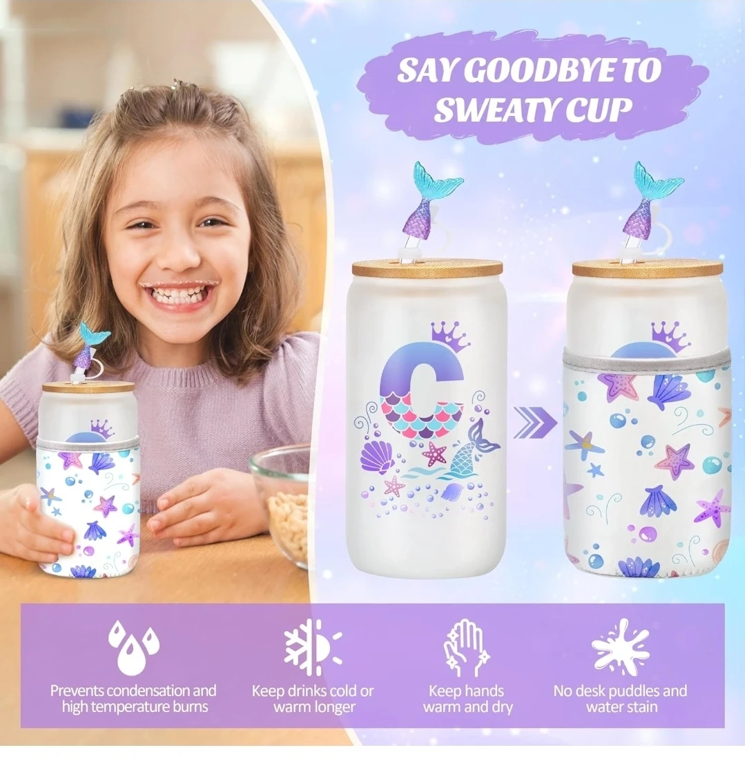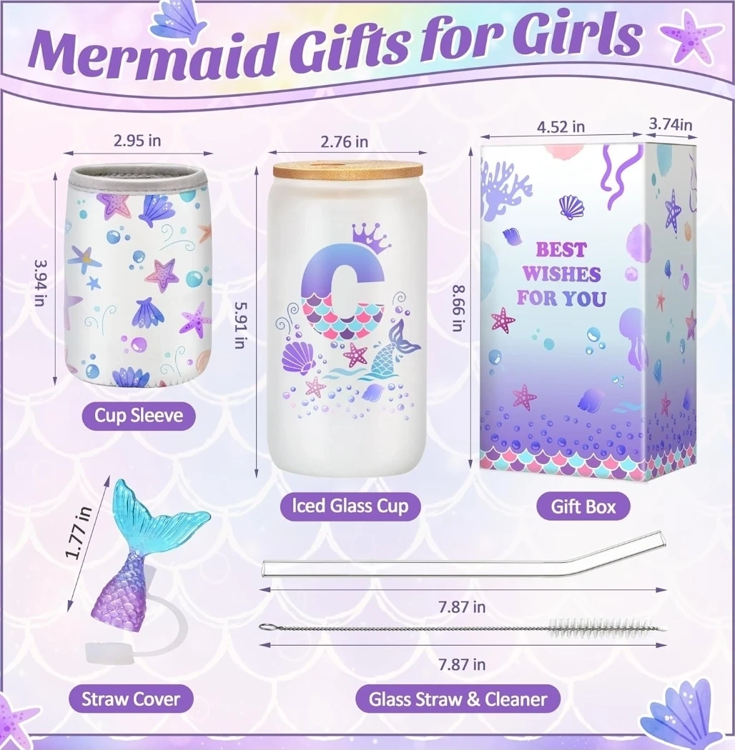 This 16oz glass cup set comes with a bamboo lid, glass straw, straw cleaner, cup sleeve, and a mermaid tail straw cover. It's made from high-quality borosilicate glass and features a fun mermaid design. The set includes a gift box with 'Best Wishes for You' printed on it.