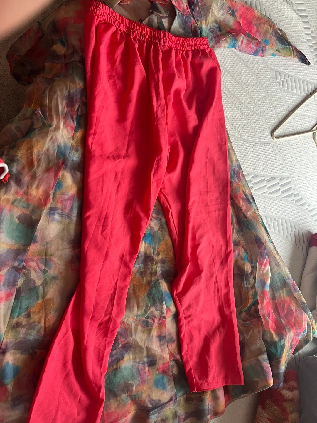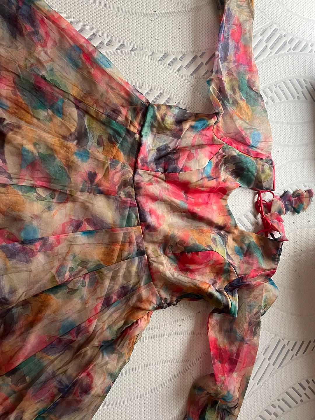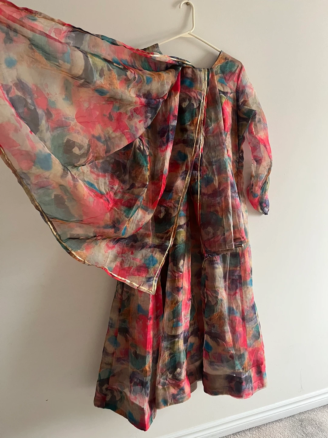 Flowy sheer Indian suit with a vibrant abstract print. It features long sleeves and a tie-back closure. Organza material. Size medium to large.