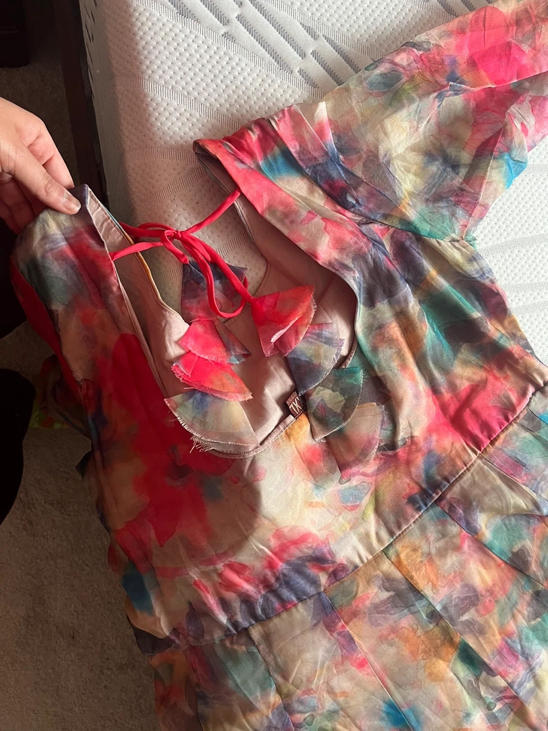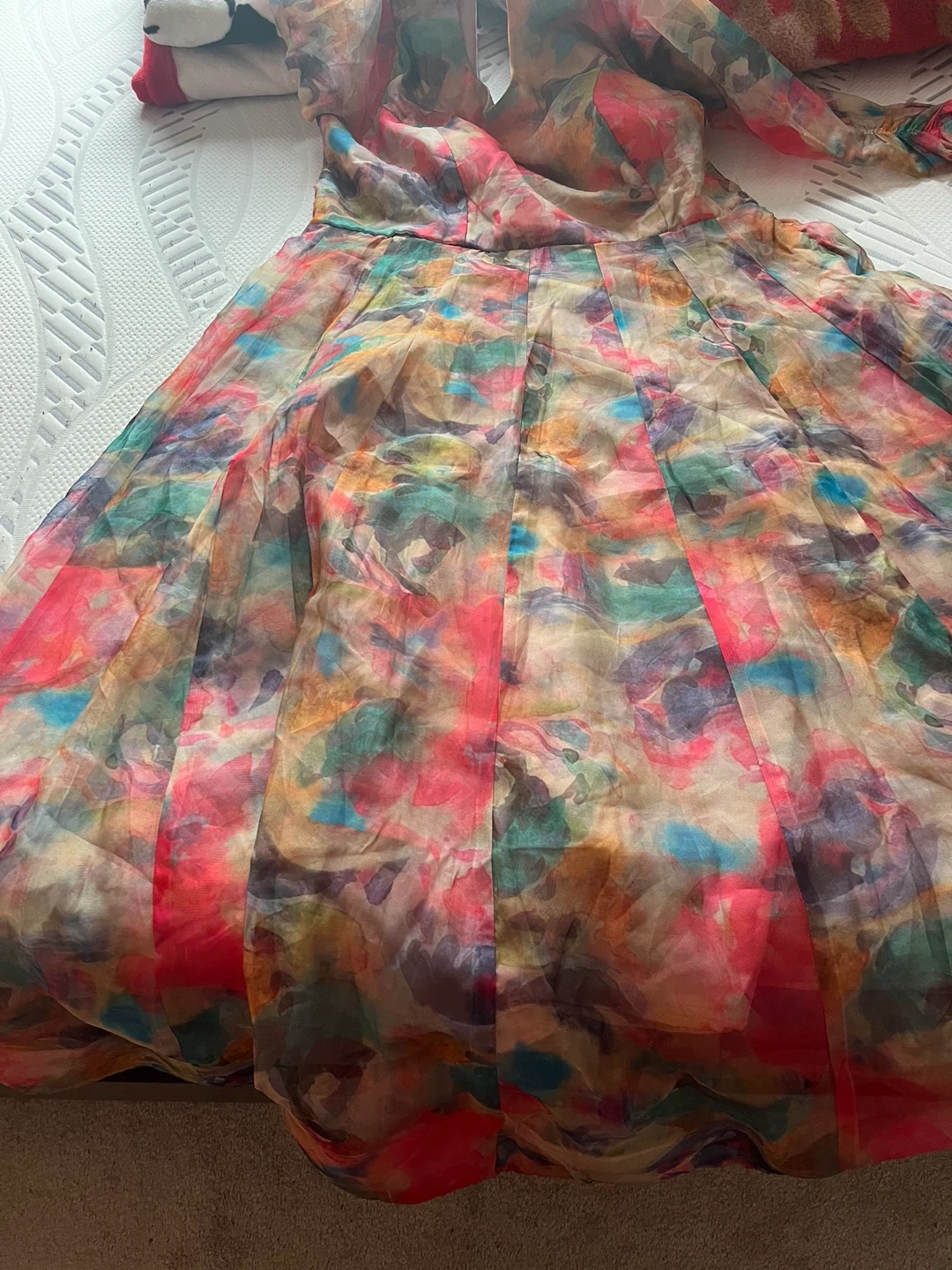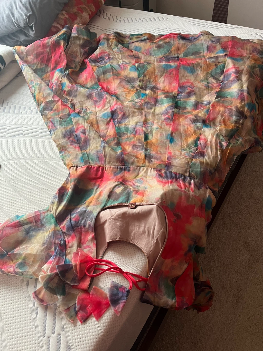 Flowy sheer Indian suit with a vibrant abstract print. It features long sleeves and a tie-back closure. Organza material. Size medium to large.