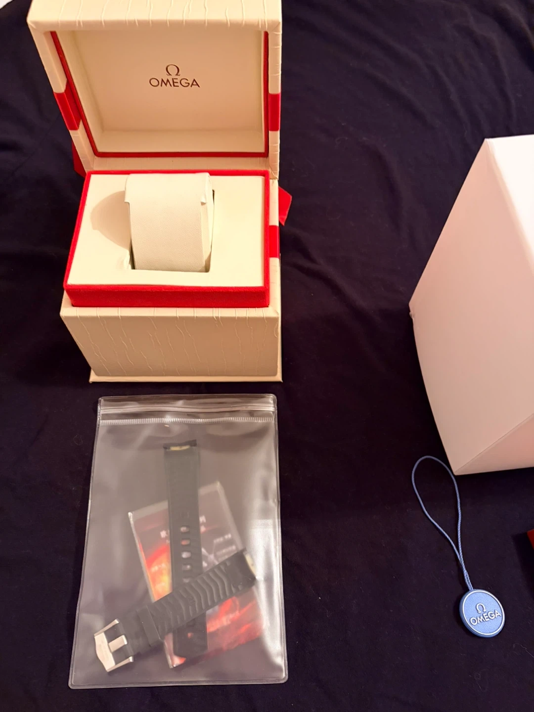 Pure 100% replica. Includes original Omega watch box, international warranty card holder, and extra watch strap. Operating instructions manual also present. Box is in excellent condition, tied with a red ribbon.