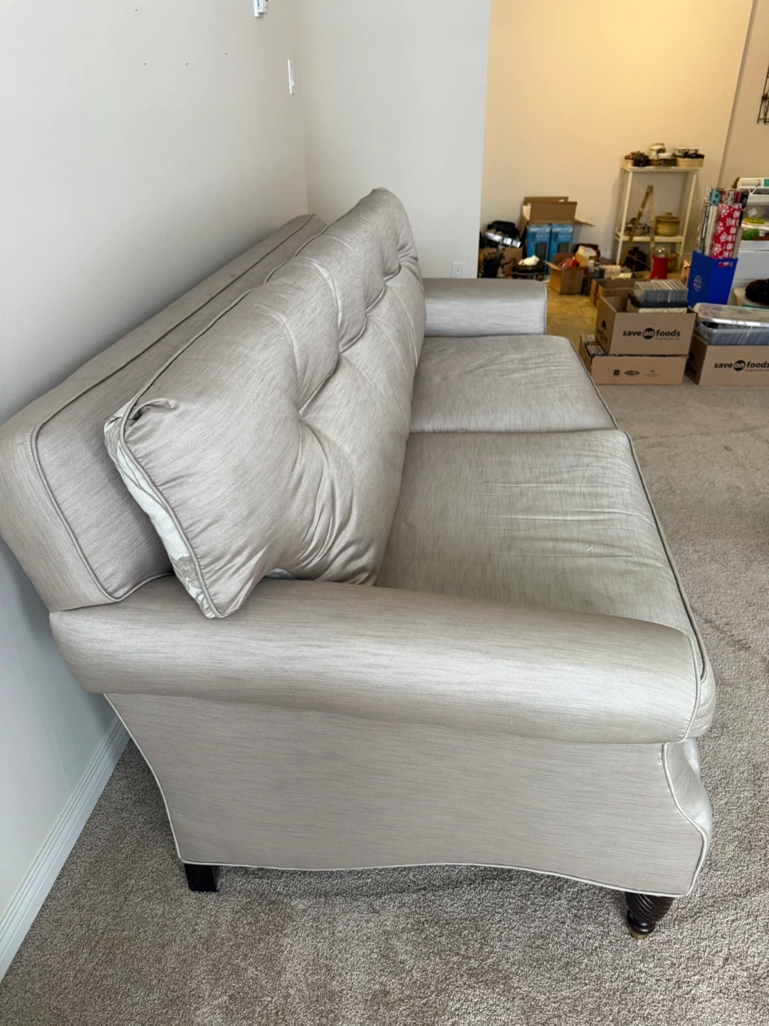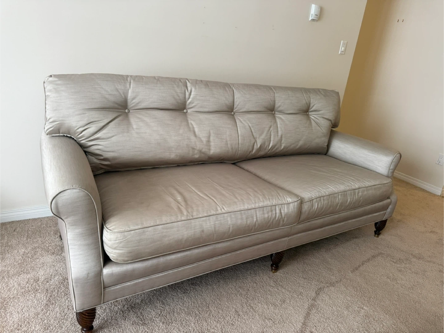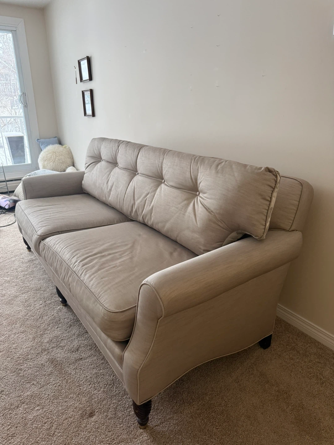 Beautiful custom-made sofa upholstered in a soft neutral fabric. The reversible seat cushions offer both patterned and solid sides, giving you styling flexibility.