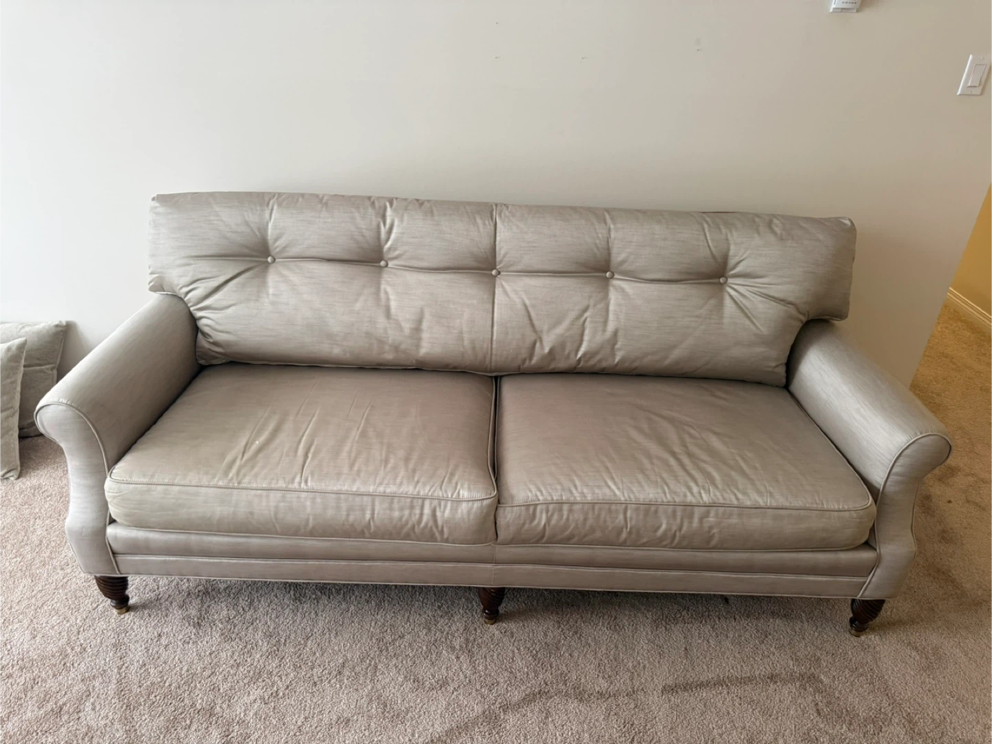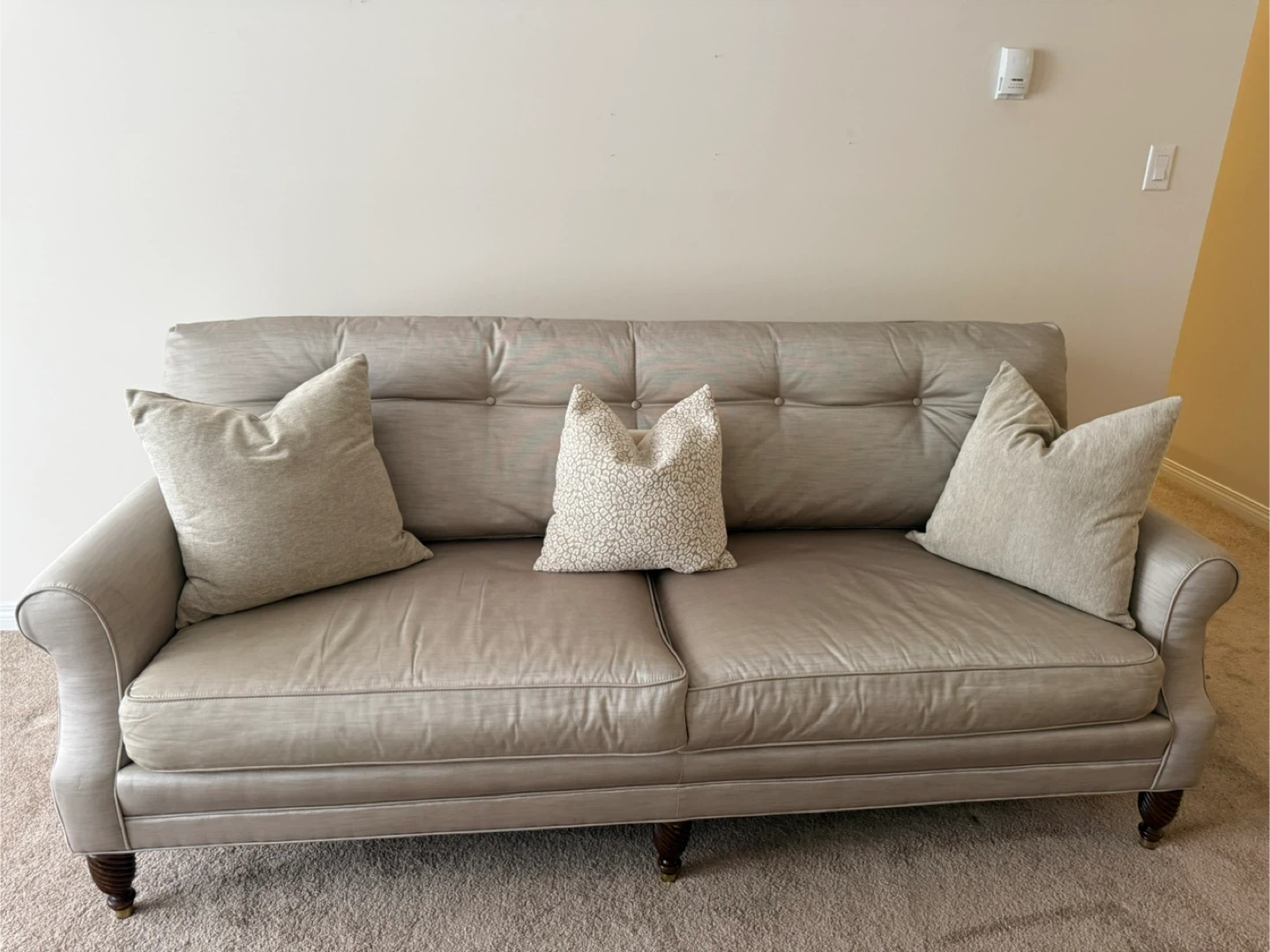 Beautiful custom-made sofa upholstered in a soft neutral fabric. The reversible seat cushions offer both patterned and solid sides, giving you styling flexibility.