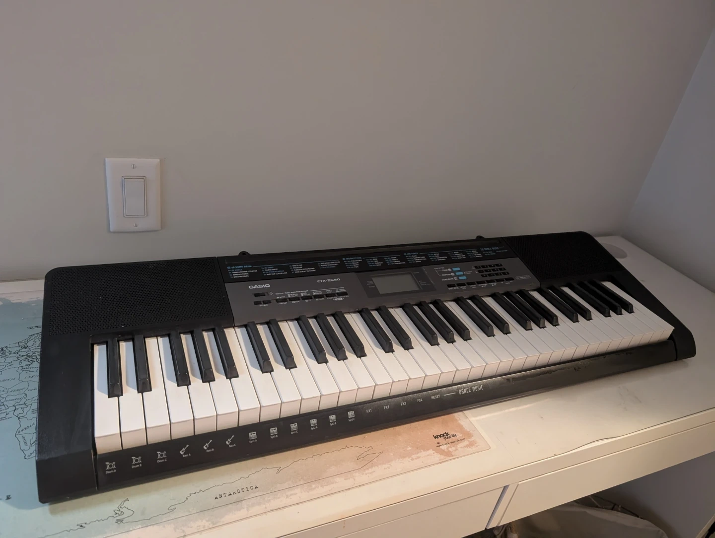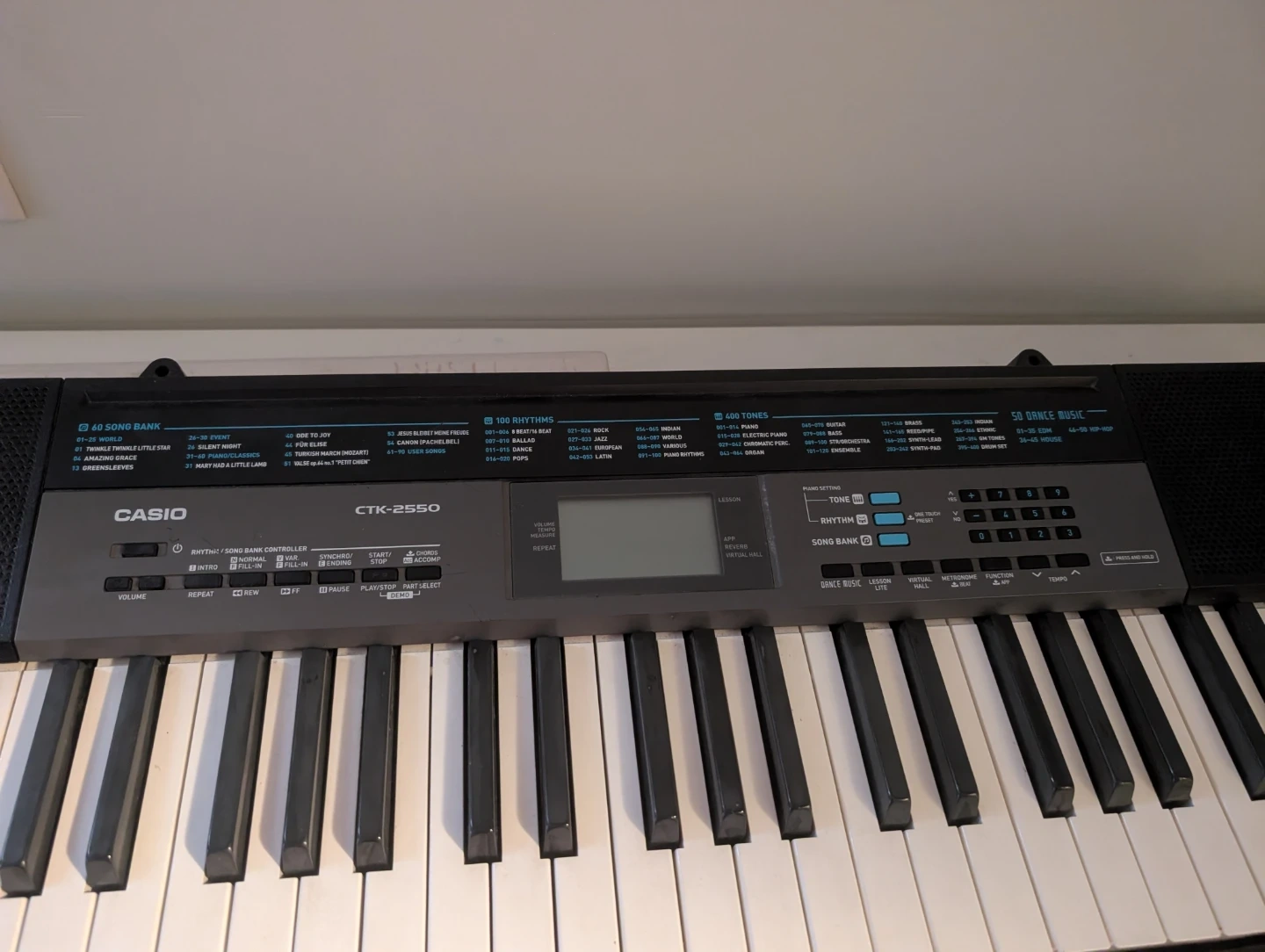 Casio CTK-2550 portable electronic keyboard. It has 61 keys and a variety of tones and rhythms. Includes a lesson function for learning to play. Great for beginners and intermediate players!