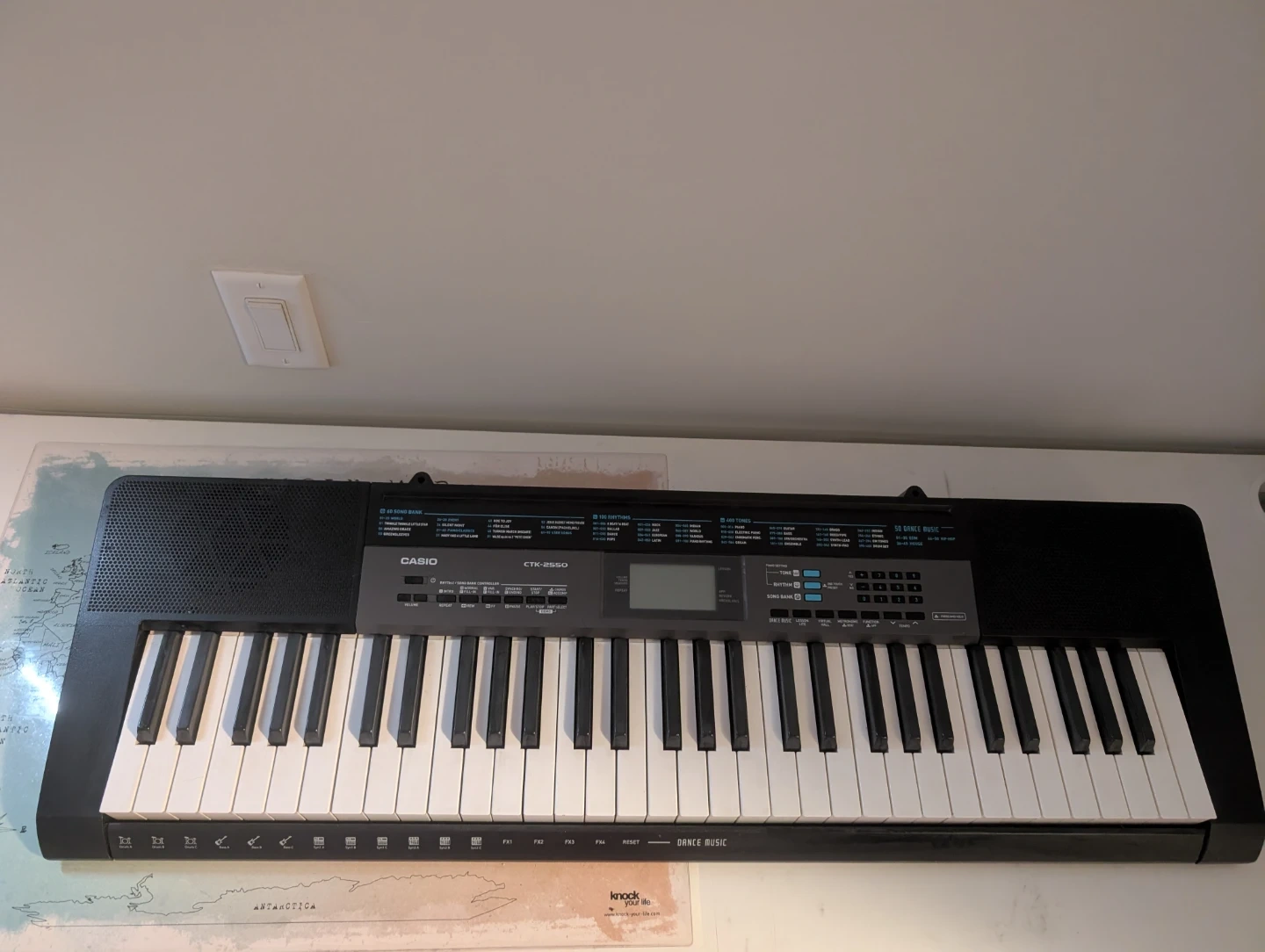 Casio CTK-2550 portable electronic keyboard. It has 61 keys and a variety of tones and rhythms. Includes a lesson function for learning to play. Great for beginners and intermediate players!