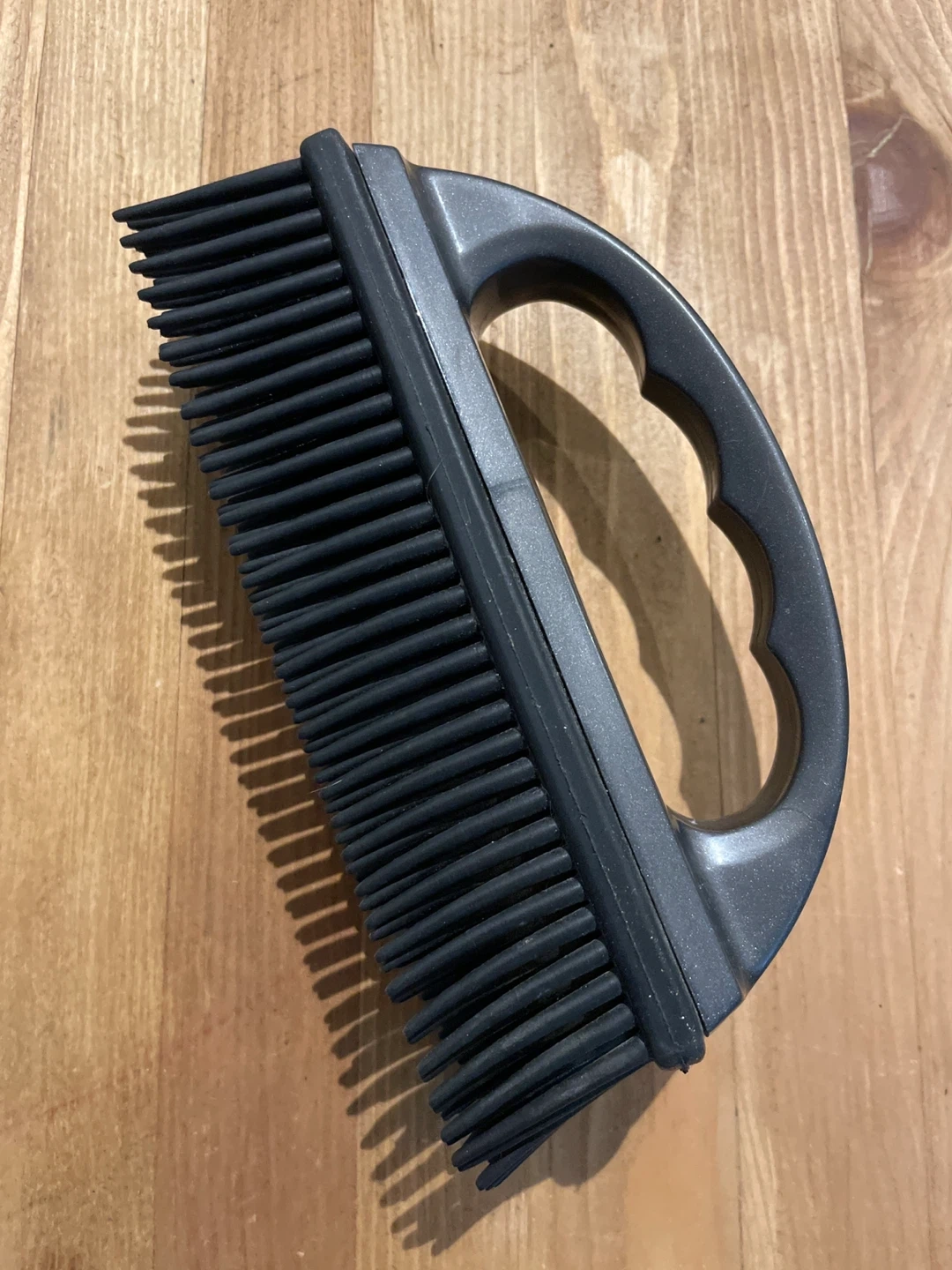 This scrub brush has stiff rubber bristles that are great for cleaning grout, tiles, and tough messes. It features a comfortable, ergonomic handle for easy grip. It's about 7 inches long.