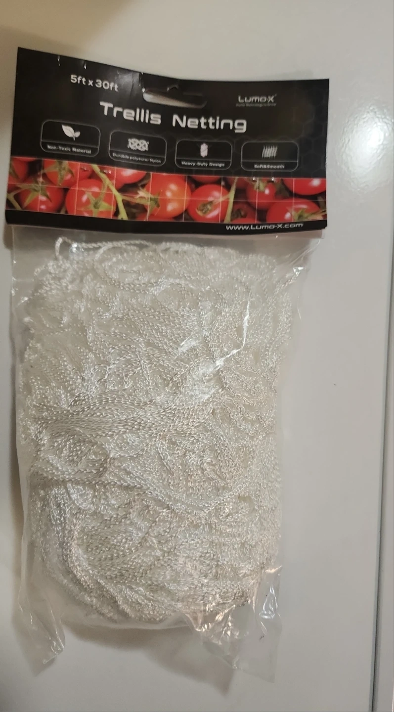 This is LUMAX Trellis Netting. It's a 5ft x 30ft roll of white, non-toxic material. It features a heavy-duty design made from durable polyester nylon. This netting is soft and smooth to the touch.