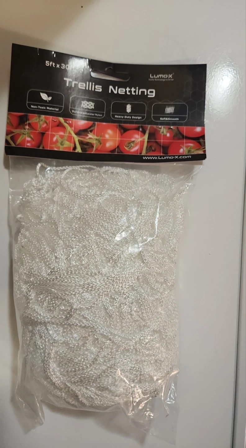 This is LUMAX Trellis Netting. It's a 5ft x 30ft roll of white, non-toxic material. It features a heavy-duty design made from durable polyester nylon. This netting is soft and smooth to the touch.