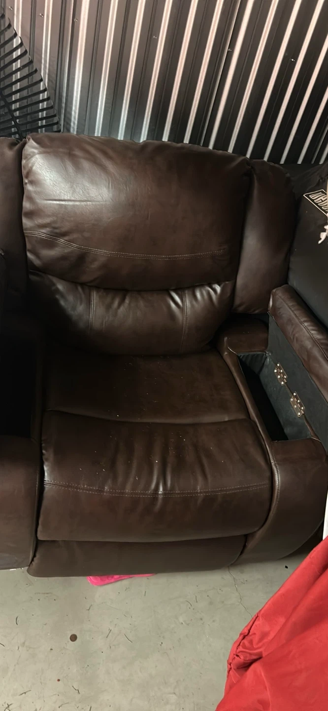 Selling a comfy brown possibly leather recliner. It's in good condition and ready for a new home!