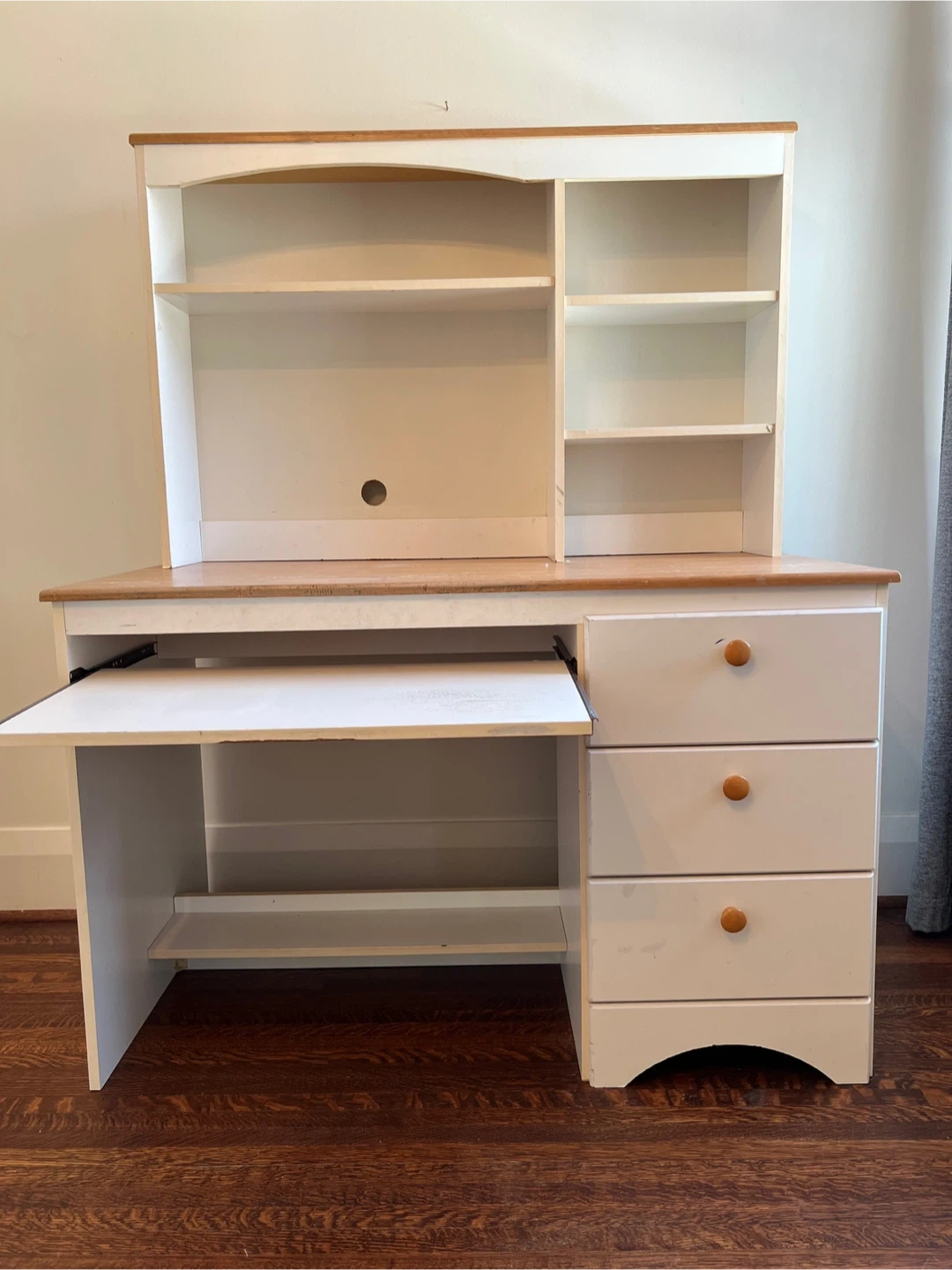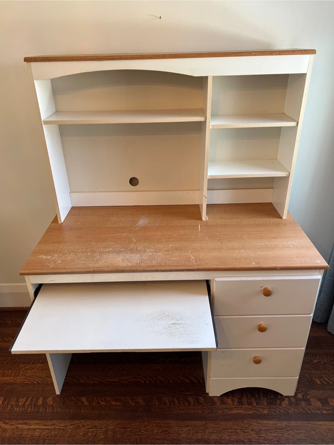 This desk has a pull-out keyboard tray and three drawers for storage. It also features a hutch with shelves for display or organization. The hutch is not attached and is removable. The desktop surface and tray show signs of wear.