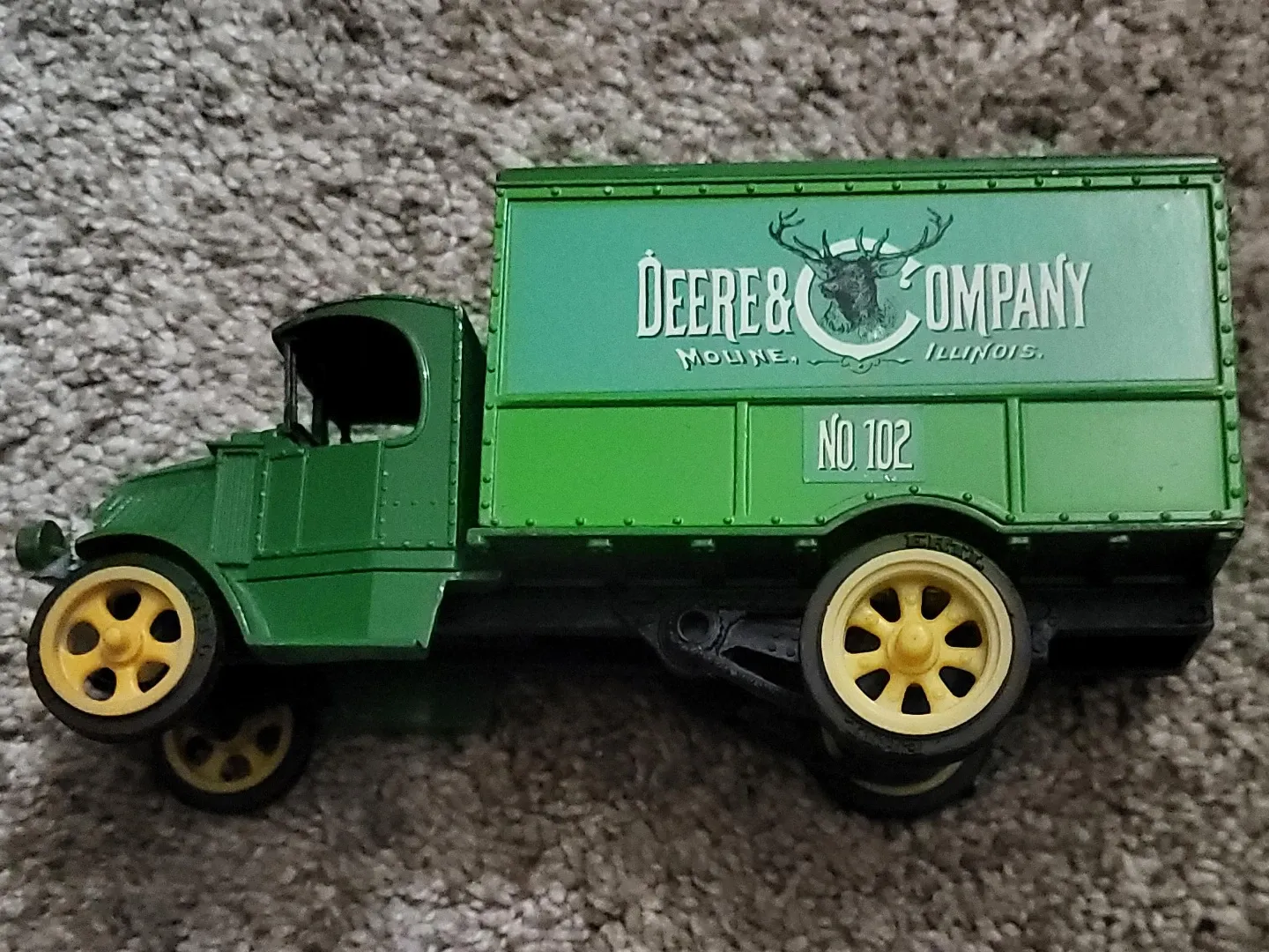 This is a John Deere & Company toy truck, model number 102. It's green with yellow wheels. The truck is a nice collectible for John Deere fans!