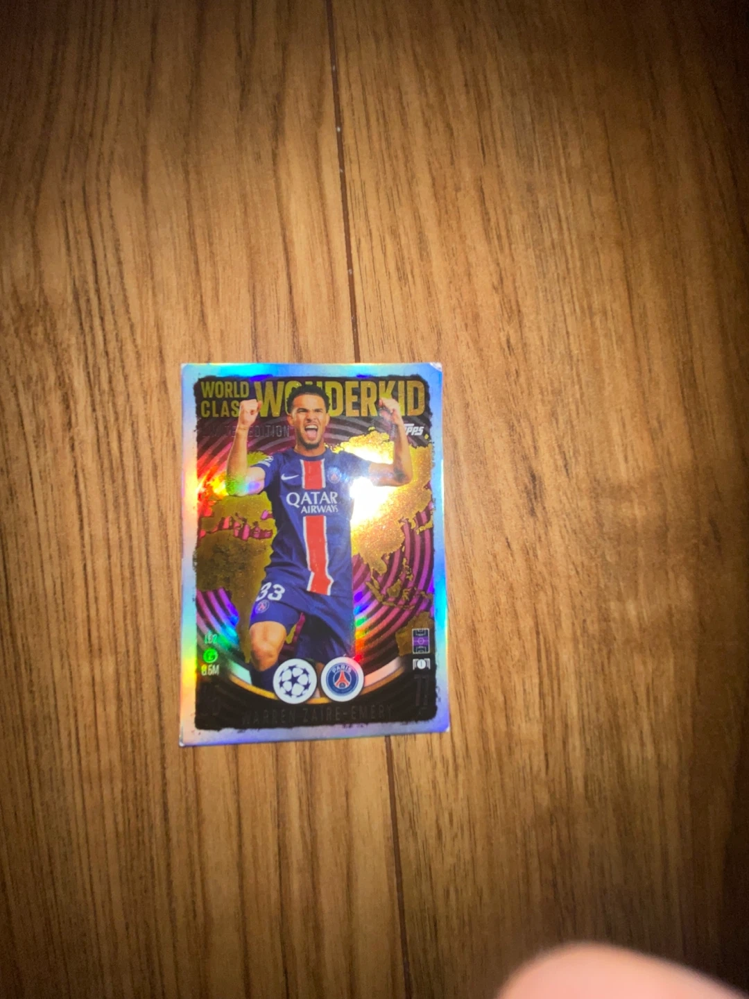 This is a Topps Champions League card featuring Warren Zaïre-Emery. It's a Wonderkid edition. The card showcases him in his PSG kit. This collectible is great for soccer fans!