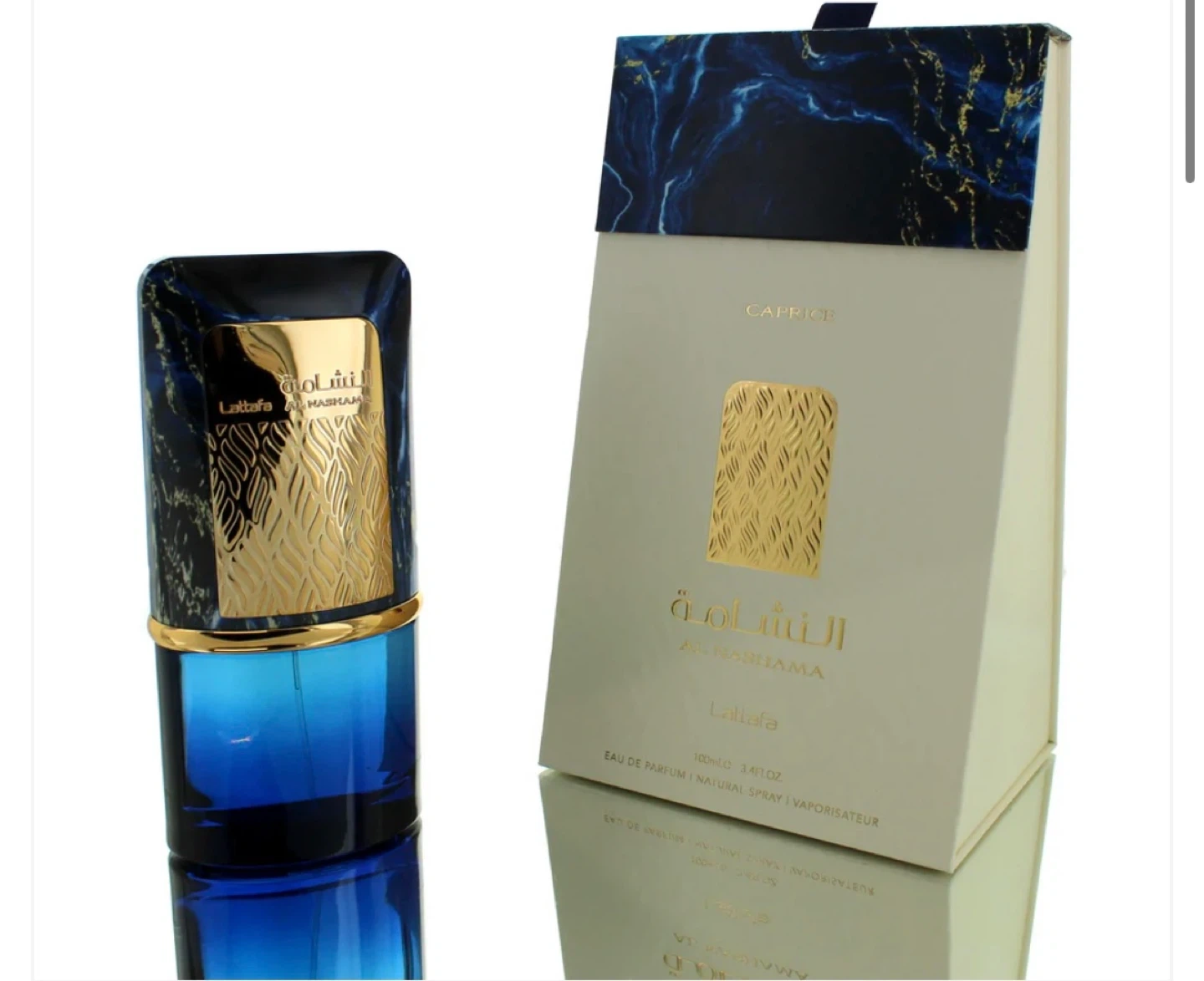This is Lattafa Al Nashama Caprice Eau de Parfum. This scent has a fresh, spicy opening with a smooth and warm feel, after drying it is a clean woody-musky scent. An attention grabber