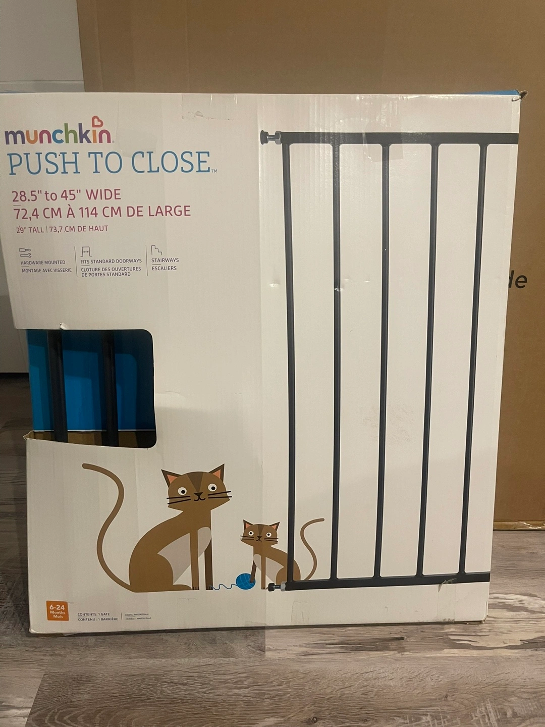 Selling a Munchkin Push to Close baby gate! It fits openings from 28.5" to 45" wide (72.4 cm to 114 cm). The gate is 29" tall (73.7 cm). It can be hardware mounted and fits standard doorways and stairways. Suitable for babies aged 6-24 months. Comes with one gate