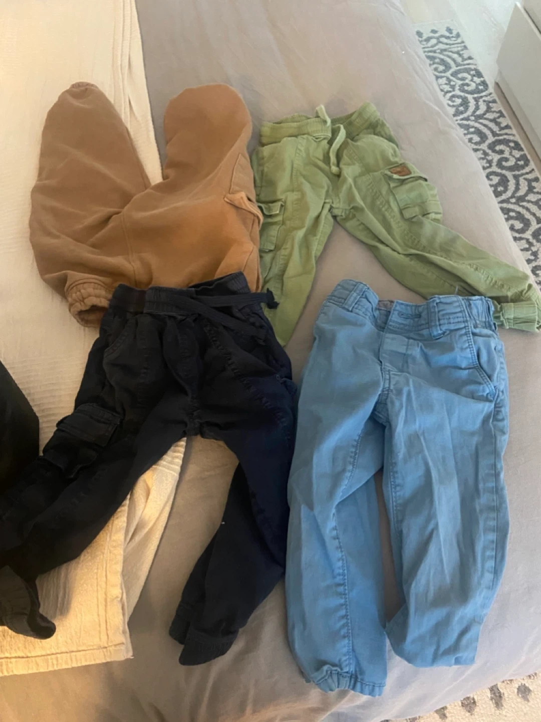 Selling a bundle of kids' clothing and shoes. Includes pants and shoes in various colors and styles. Perfect for a growing child!