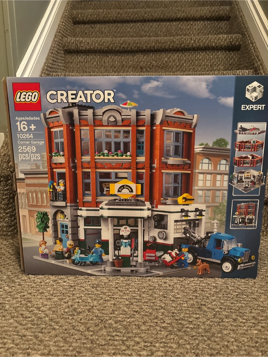 This is the LEGO Creator Expert Corner Garage building set. It's model number 10264 and includes 2569 pieces. This set is designed for ages 16 and up. It's part of the Expert series for advanced builders.