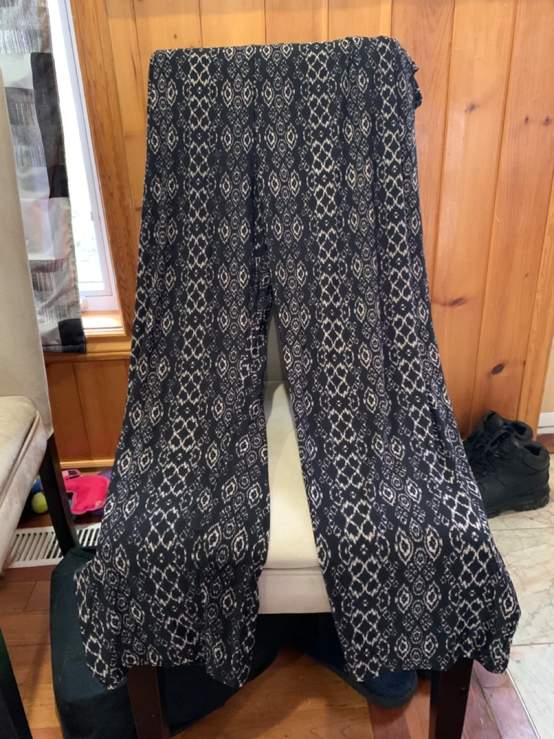 Comfy black and beige patterned flowy pants. These pants have a relaxed fit and are made from a soft, lightweight fabric. Waistband is elasticized.