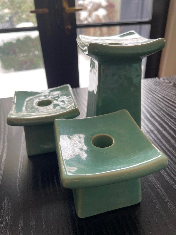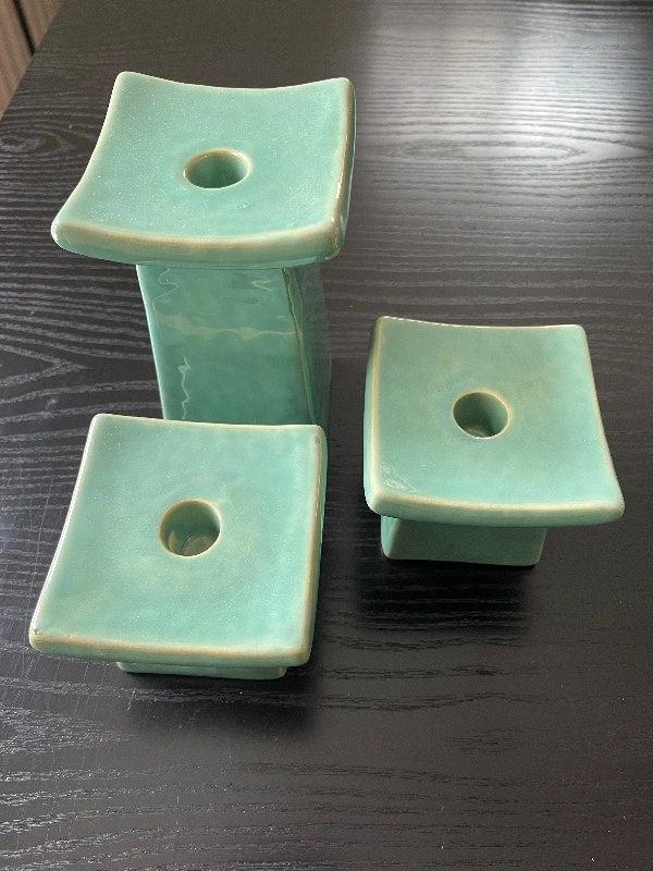 A pretty set of three candle holders in a soft jade green colour. Material is ceramic. In excellent condition—no chips or scratches, like new. Asking $15 for the set of three or best offer. Pickup at Davisville station.