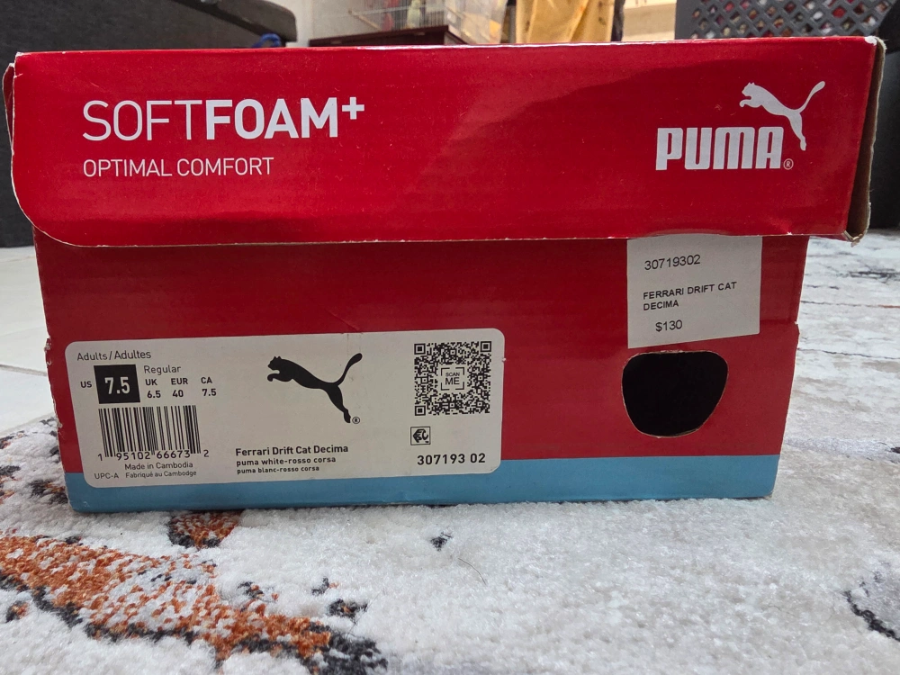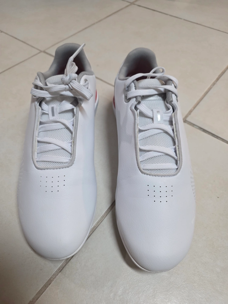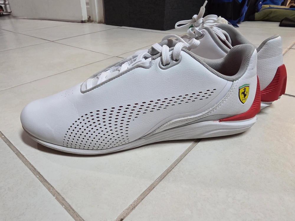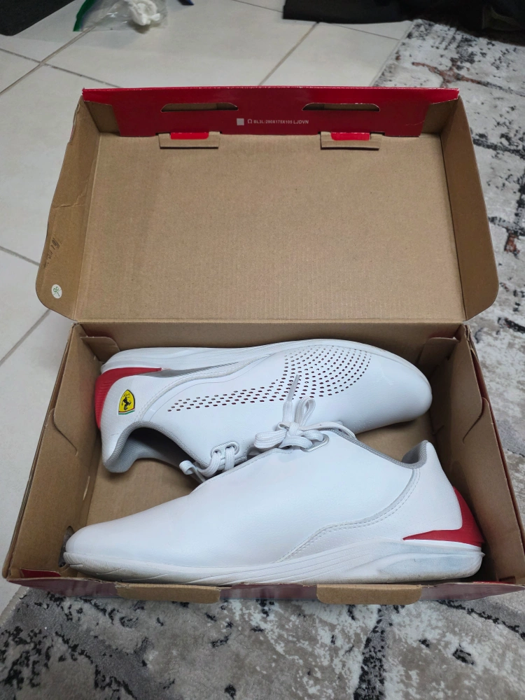 These white Puma Future Cat shoes feature red accents and the iconic Ferrari logo. They're crafted with synthetic leather for a sleek look. Perforated details add breathability. My kid just worn it couple of times. in good condition.