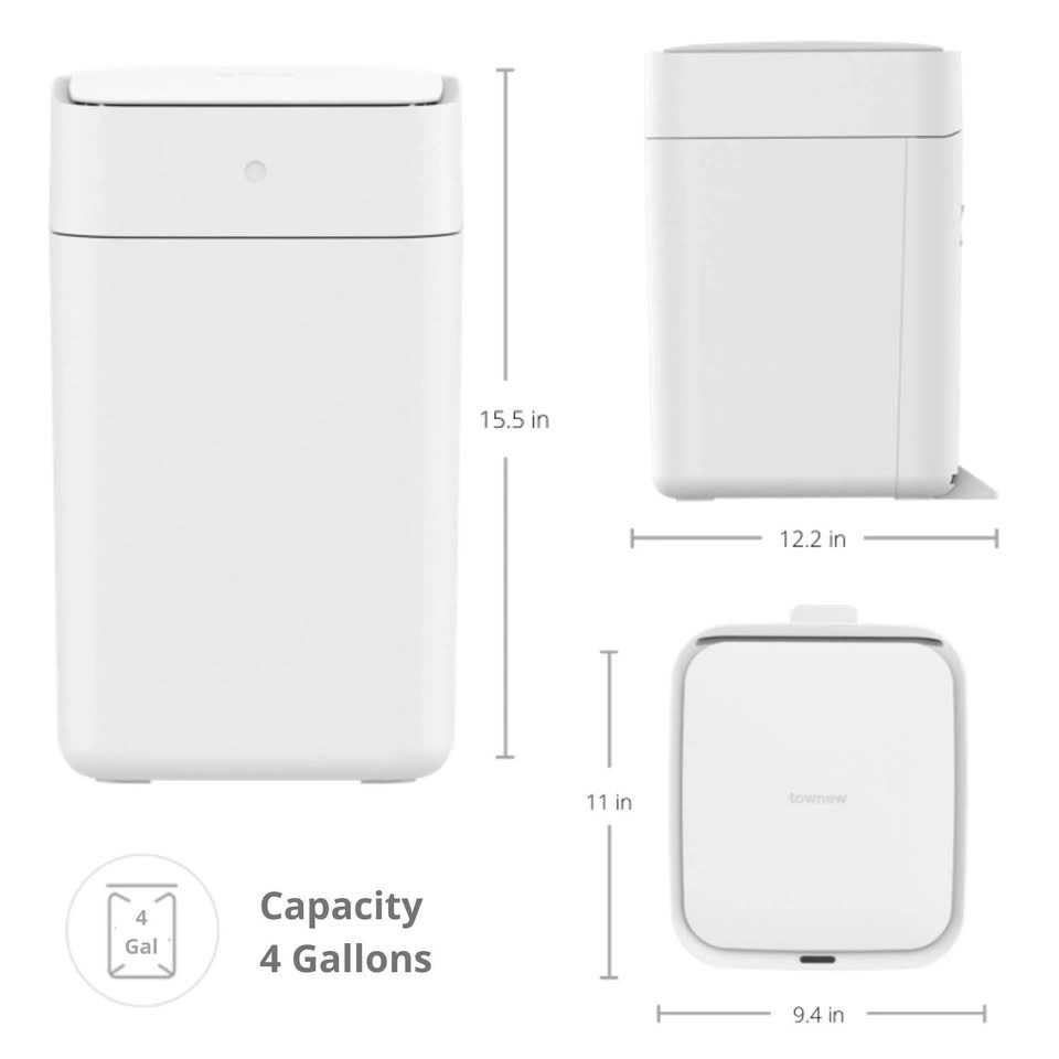The TOWNEW T1 is the world's first trash can that seals and changes the bag for you. It helps make dealing with trash simpler and less messy. No more smell, sticky buildup, or 'garbage juice'. The TOWNEW is engineered to seal and change the trash bag automatically, so you don't have to. Technical Specifications: Product Weight: 3.5kg, Product Size: 240 x 310 x 402 mm (9.4 x 12.2 x 15.8 in). Battery: 12V 2.2AH, Charging time: 10H. Adapter: 13.8V 0.65A. Let me know if you're interested!