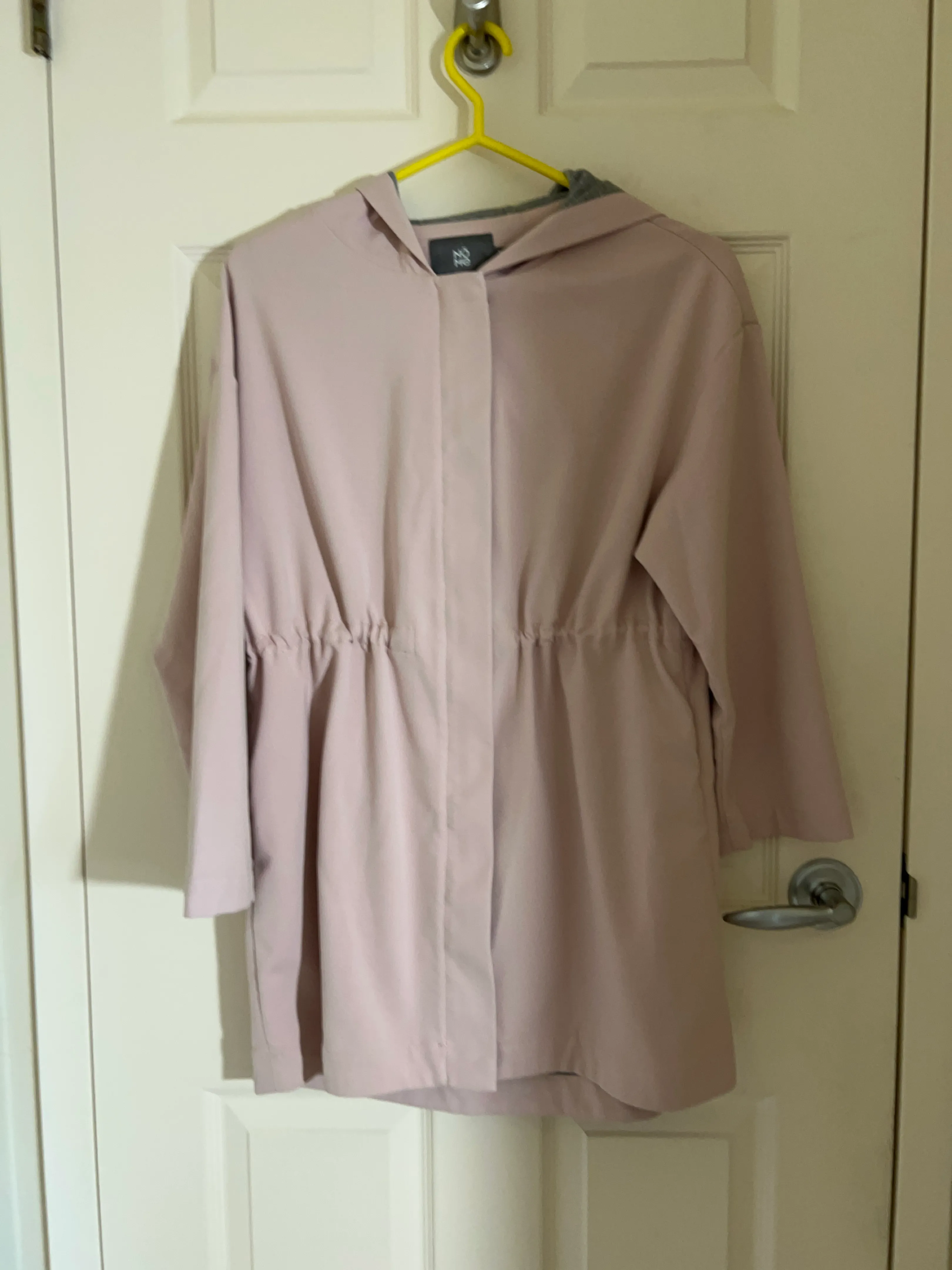 This hooded parka jacket is a lovely pale pink colour. It features a drawstring waist for a customizable fit. The material looks to be lightweight and suitable for layering.