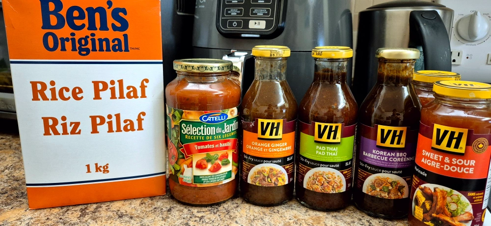 Assorted sauces and Ben's Original Rice Pilaf. Includes Catelli pasta sauce, VH stir-fry sauces (orange ginger, Pad Thai, Korean BBQ, sweet and sour). Great for meal prepping.