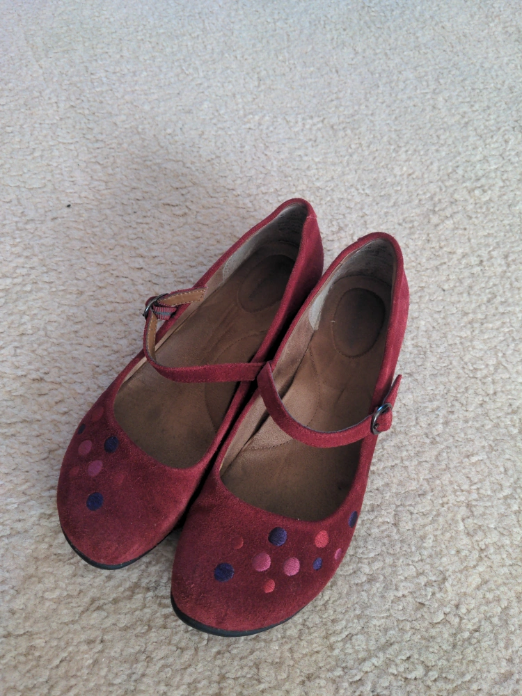 Comfortable suede Mary Jane shoes in a rich red colour. They feature a decorative polka dot pattern across the toes and a secure ankle strap. Made by Hush Puppies, these shoes offer a stylish and practical option for everyday wear.