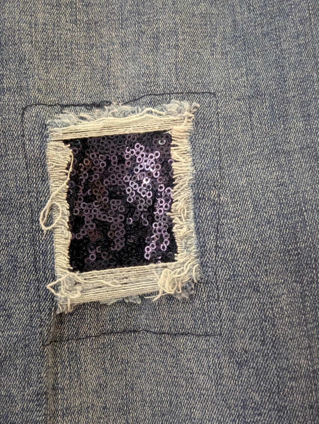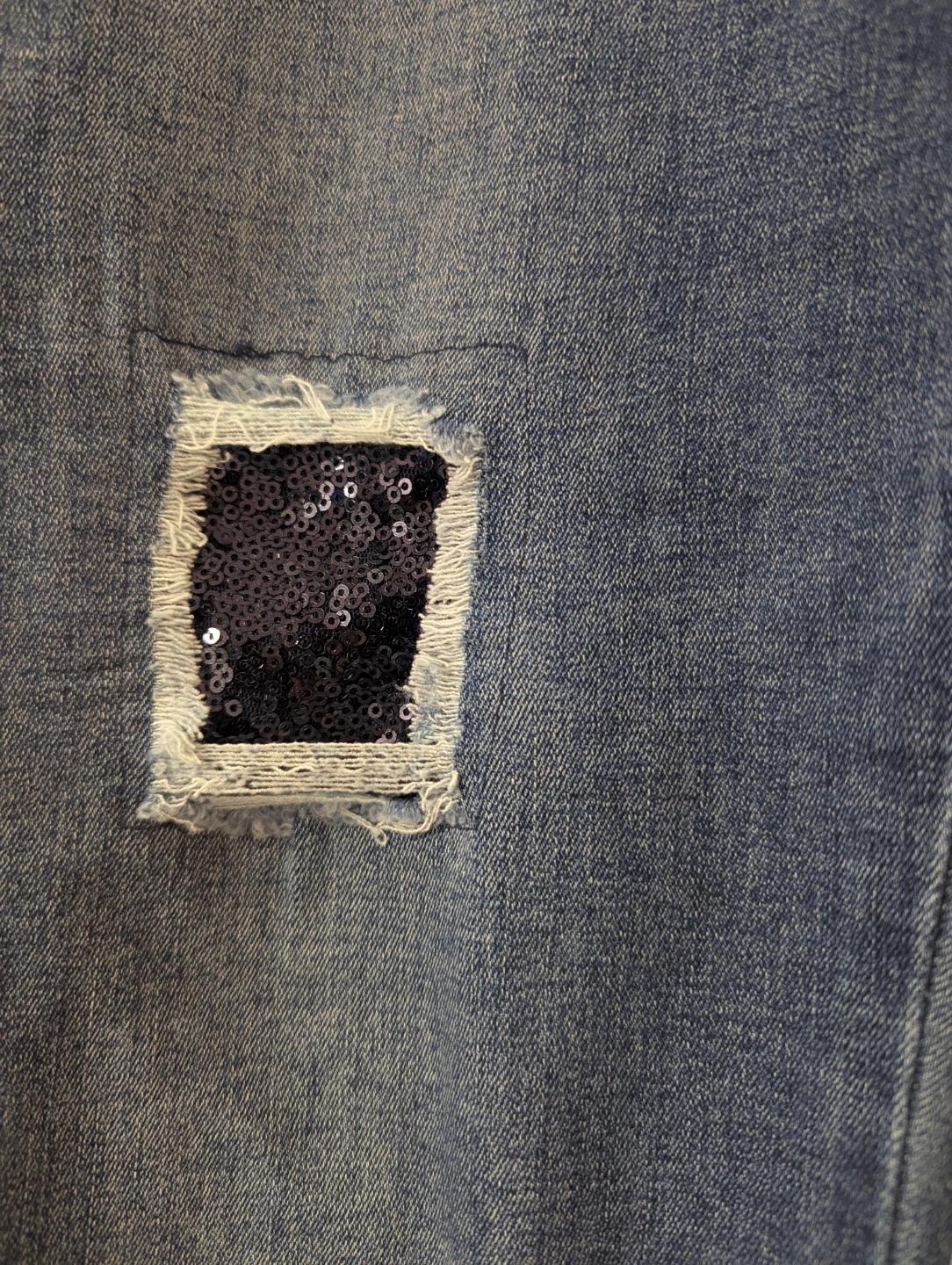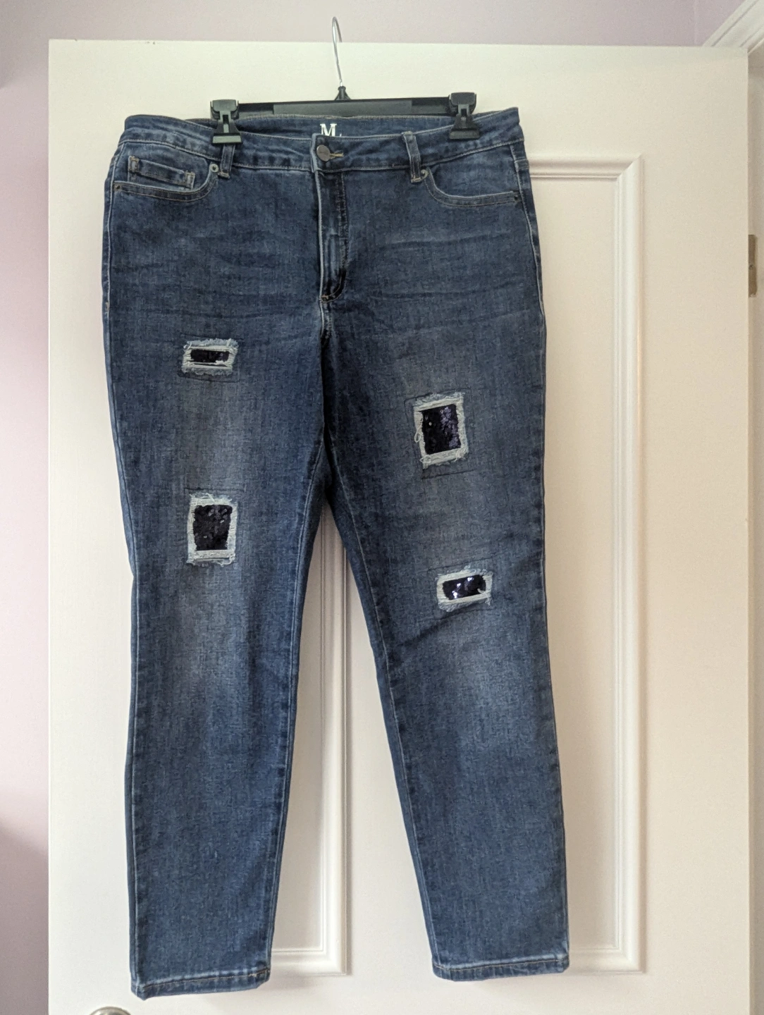 Dark wash denim jeans. Features several patches of dark sequins. Excellent condition.