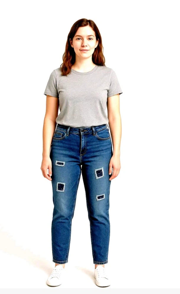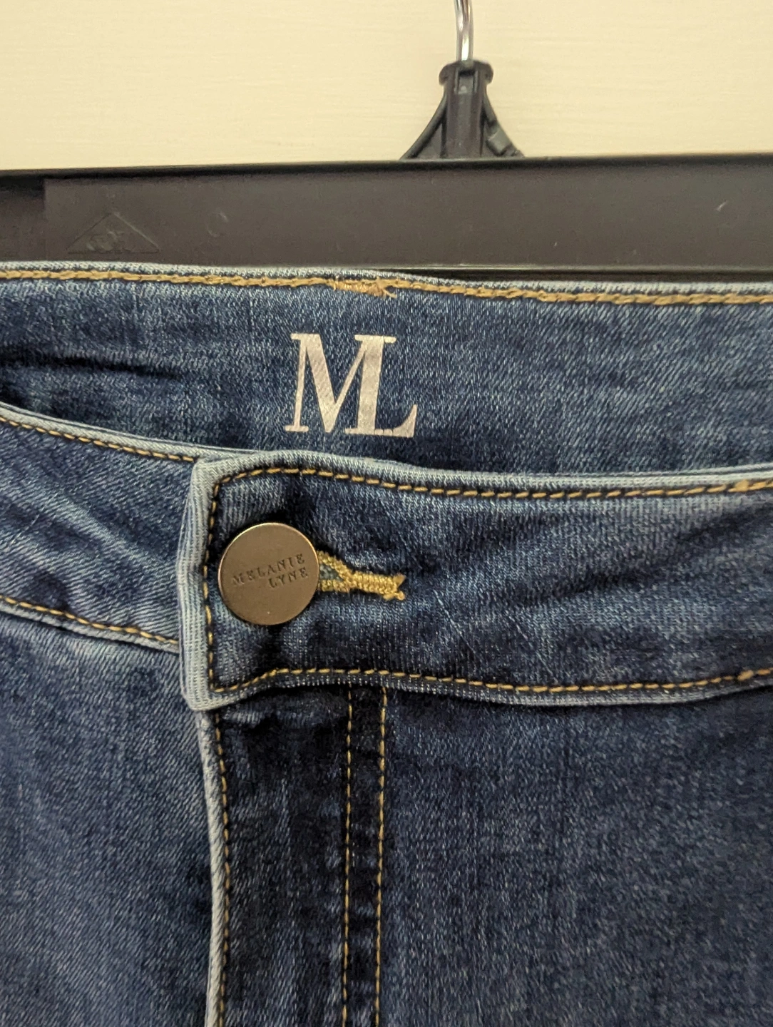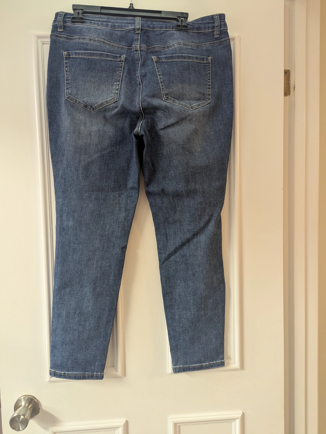 Dark wash denim jeans. Features several patches of dark sequins. Excellent condition.