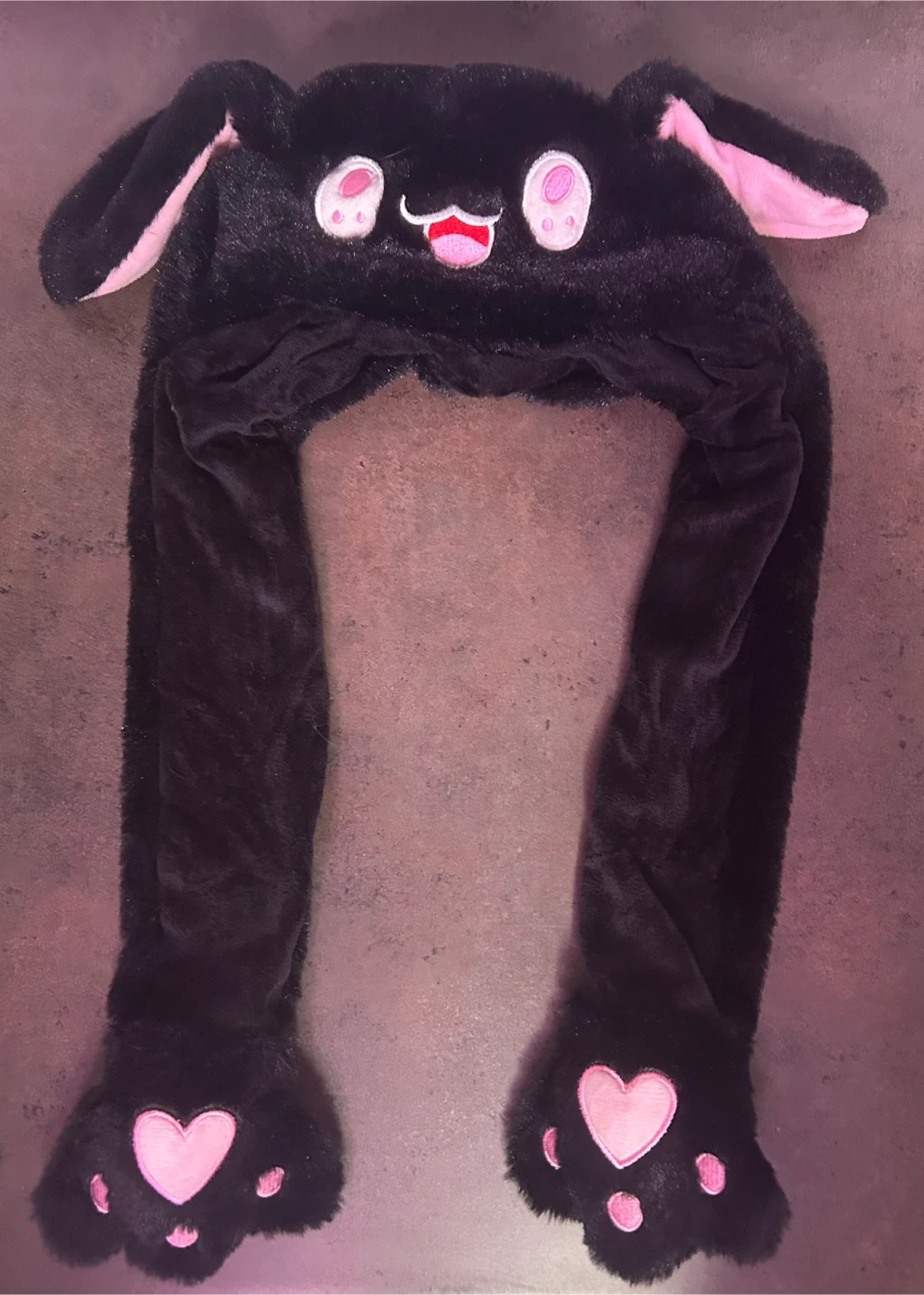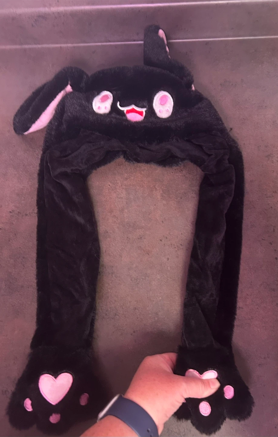 Super cute black bunny hat! It has adorable pink accents on the ears and paws. The ears also move when you squeeze the paws, which is a fun little feature. Perfect for keeping warm and looking cute!